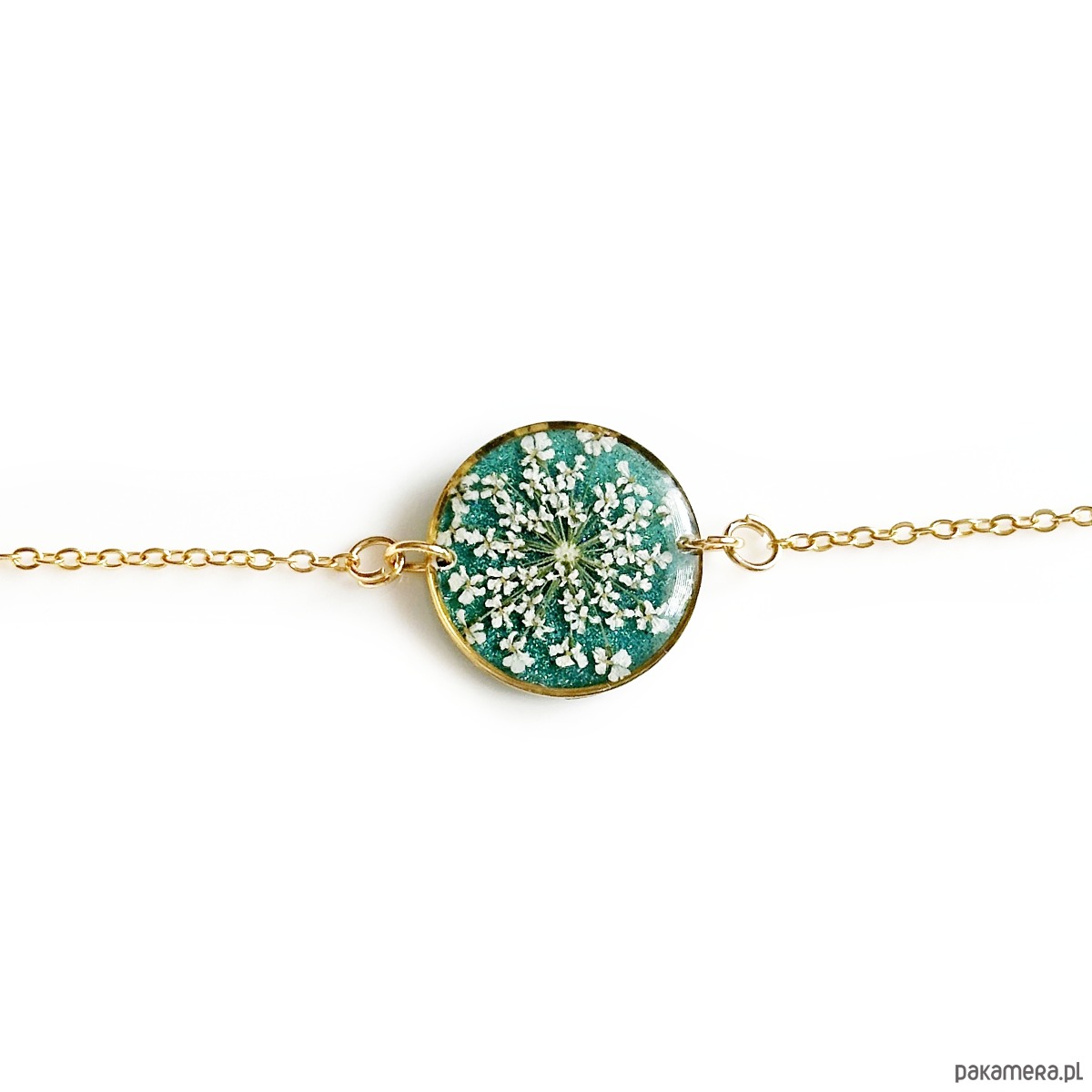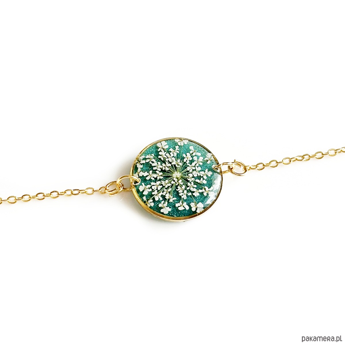 Bransoletka z dziką marchwią jest wykonana ze stali szlachetnej oraz żywicy epoksydowej.
