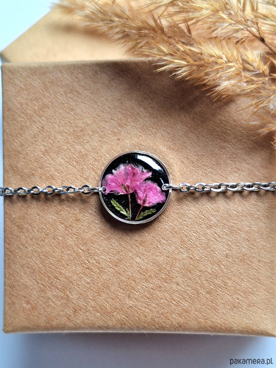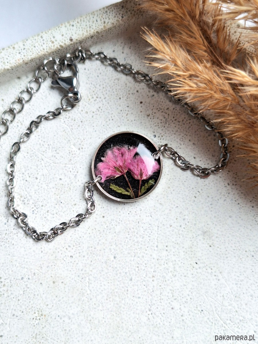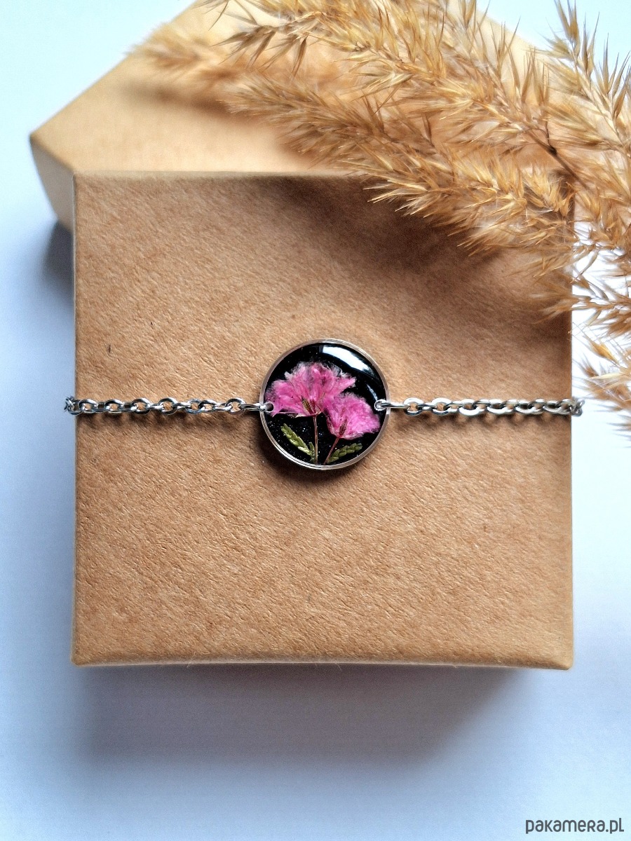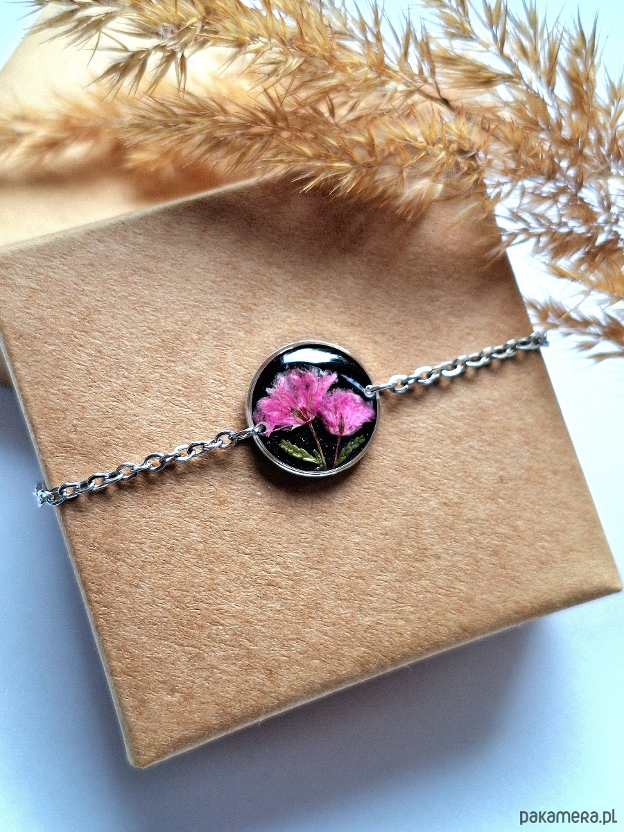 Urocza bransoletka z zatopionymi kwiatami różowej gipsówki na czarnym brokatowym tle w srebrnej oprawie. Wykonana z wysokiej klasy żywicy, która nie zmienia koloru pod wpływem promieniowania uv oraz wysokiej jakości stali chirurgicznej.