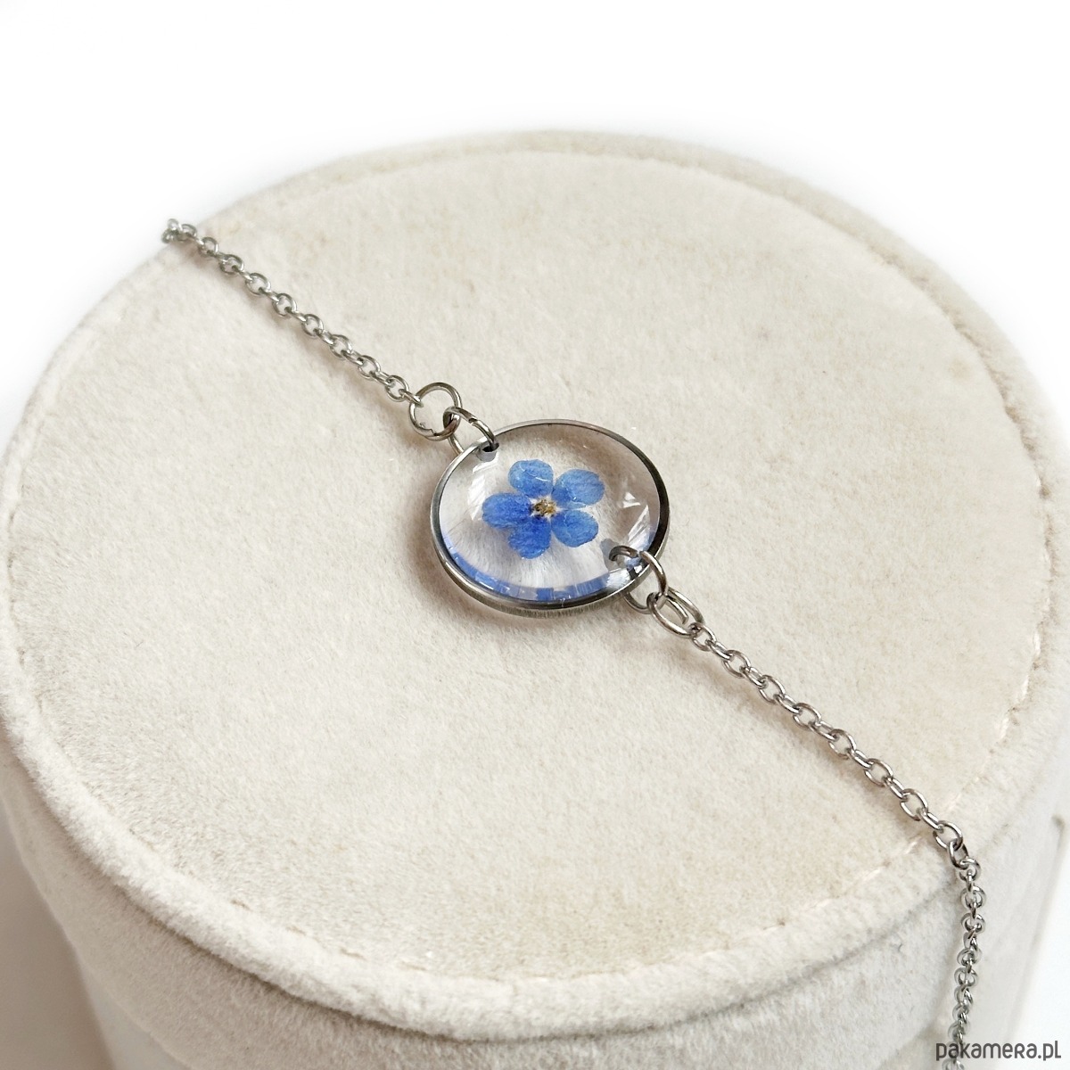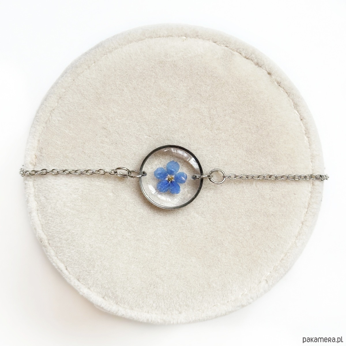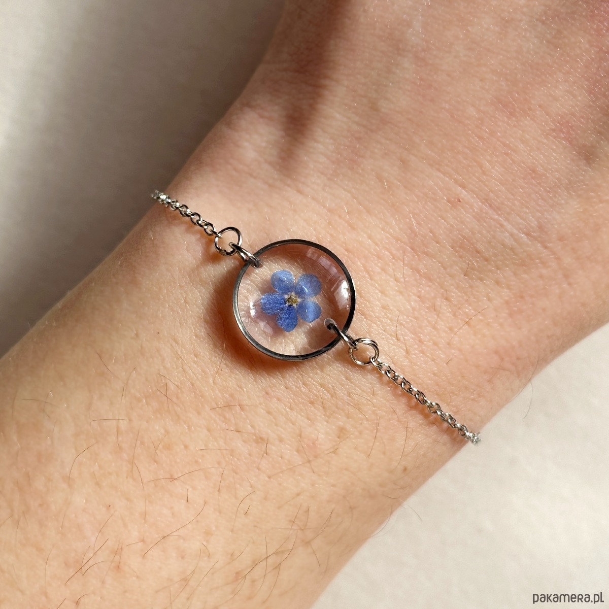 Delikatna bransoletka z kwiatami w żywicy o wymiarach 1,6cm. Zostały w niej zatopione kwiaty niezapominajki.
