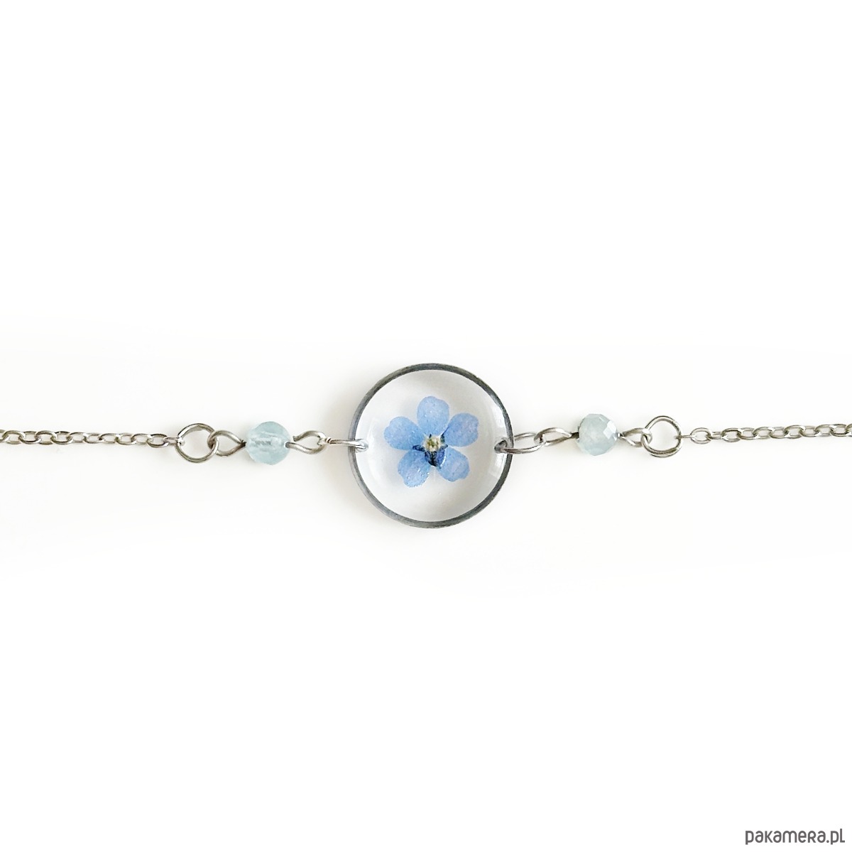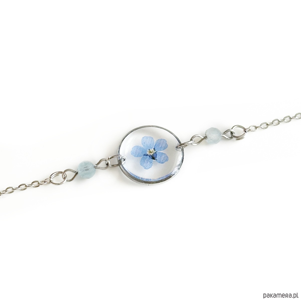 Delikatna bransoletka z akwamarynem i kwiatami w żywicy o wymiarach 1,6cm.