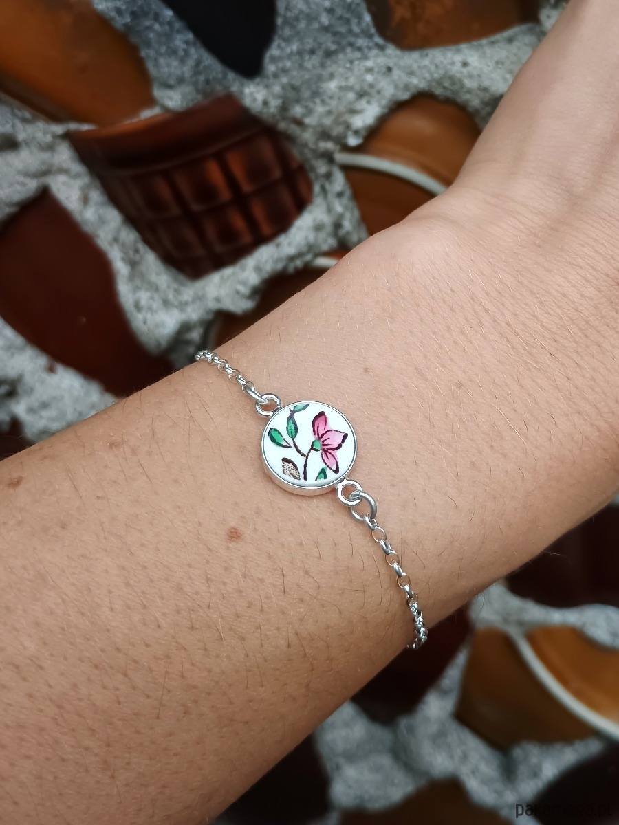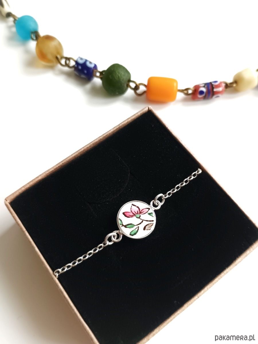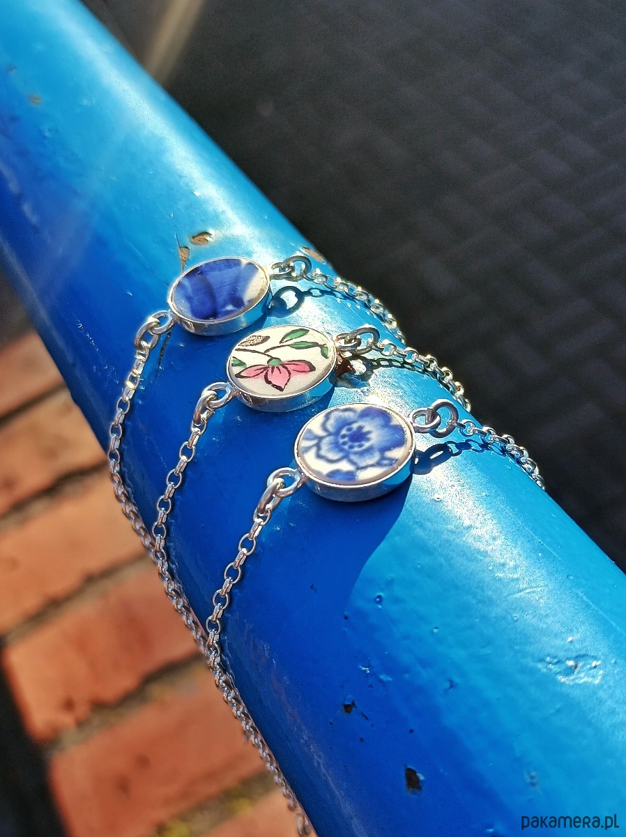 Oto delikatna bransoletka, którą wykonałam z fajansu angielskiego Copeland Spode we wzory roślinne i owady. Kawałek stłuczki oszlifowałam, osadziłam w srebrnej oprawie i zamocowałam na srebrnym łańcuszku (srebro 925). Długość łańcuszka w całości: 18 cm. Średnica zawieszki: 12 mm. Bransoletkę można zapiąć na dowolne ogniwko, co daje możliwość regulacji rozmiaru. Na końcu łańcuszka zamocowałam zawieszkę w kształcie kuli, również ze srebra. Unikat - każdy z moich wyrobów występuje w jednym egzemplarzu. Upcykling - nie reprodukuję wykorzystywanych wzorów, niczego nie domalowuję - wykorzystuję wyłącznie oryginalne naczynia i motywy, które się na nich znajdują. Tym samym, stłuczce z odzysku nadaję nowe życie.