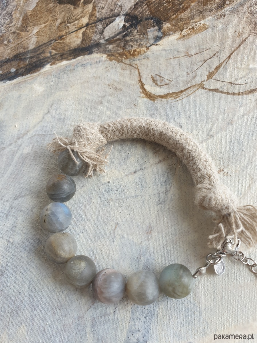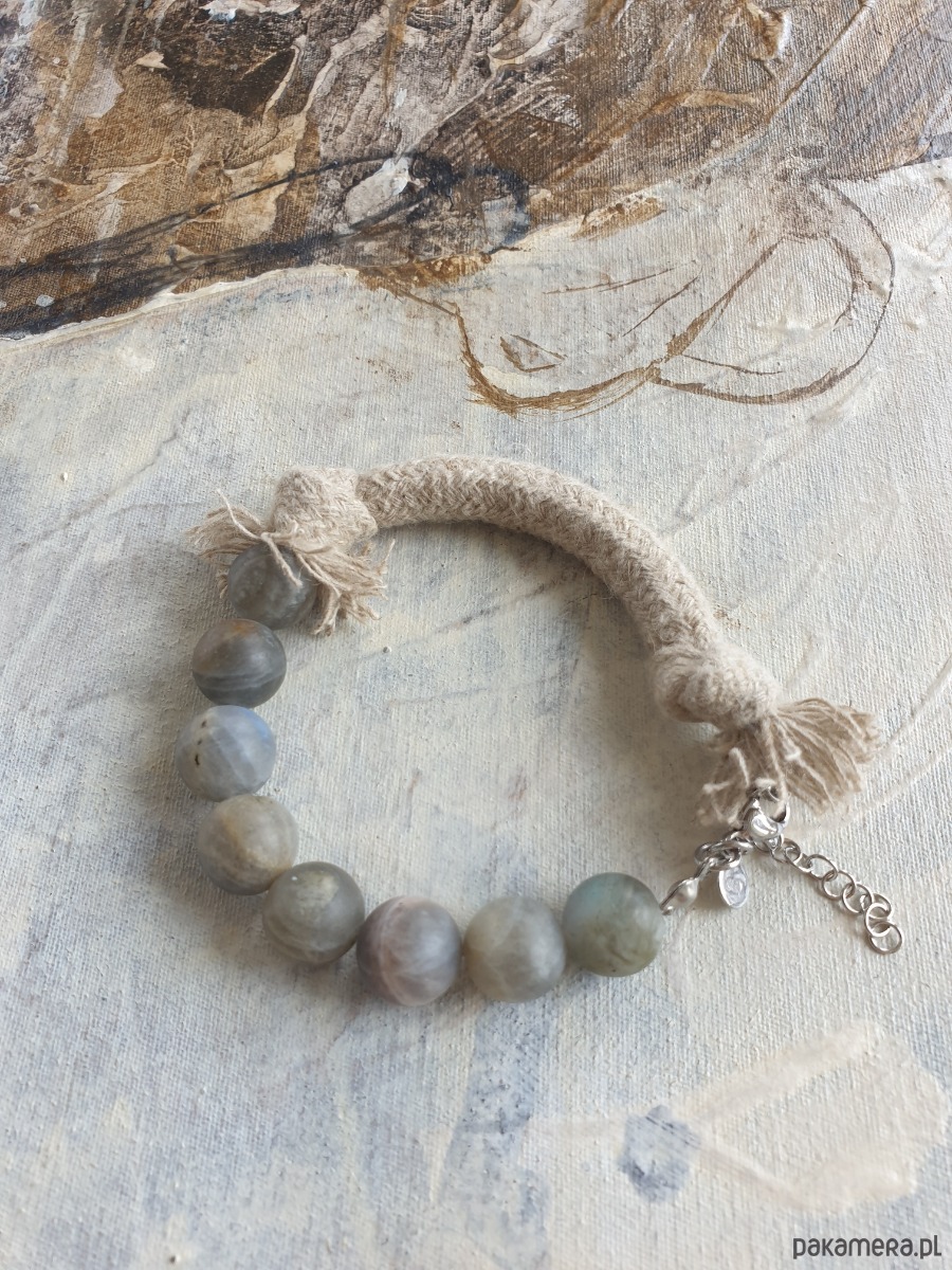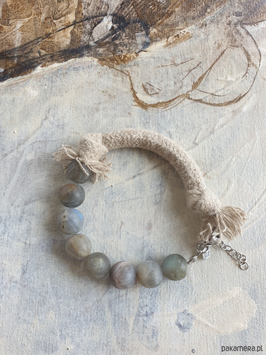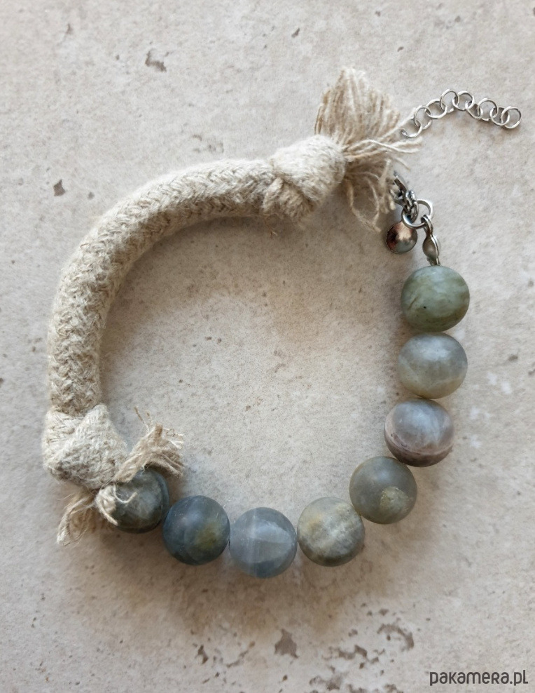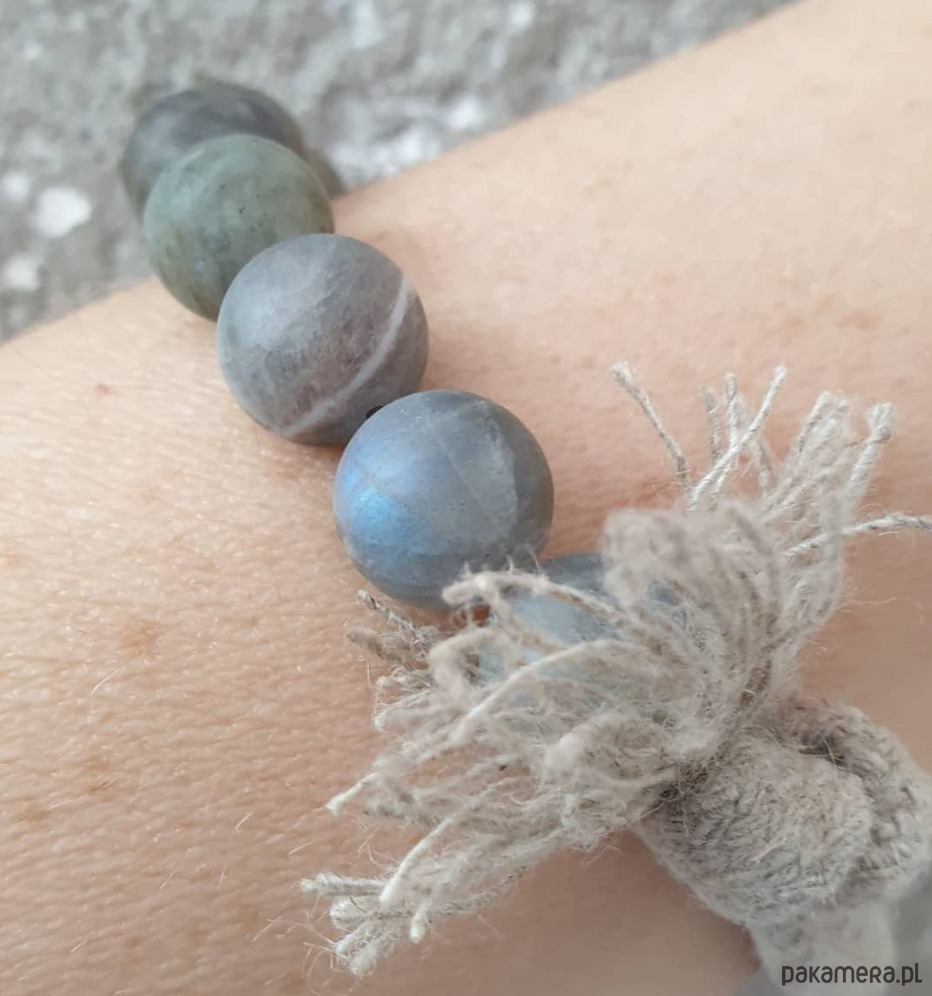 Autorska minimalistyczna bransoletka z kolekcji WĘZŁY z dużymi kamieniami. Tworzona ręcznie z kamieni naturalnych, elementów ze stali szlachetnej (antyalergicznej) i lnianego sznura. W tej - matowa kulka labradoryt. Na zdjęciu przykładowa sztuka, bransoletki tworzę na zamówienie z tych samych kamyczków, zachowując tą samą tonacje kolorystyczną, ale mogą się minimalnie różnić.