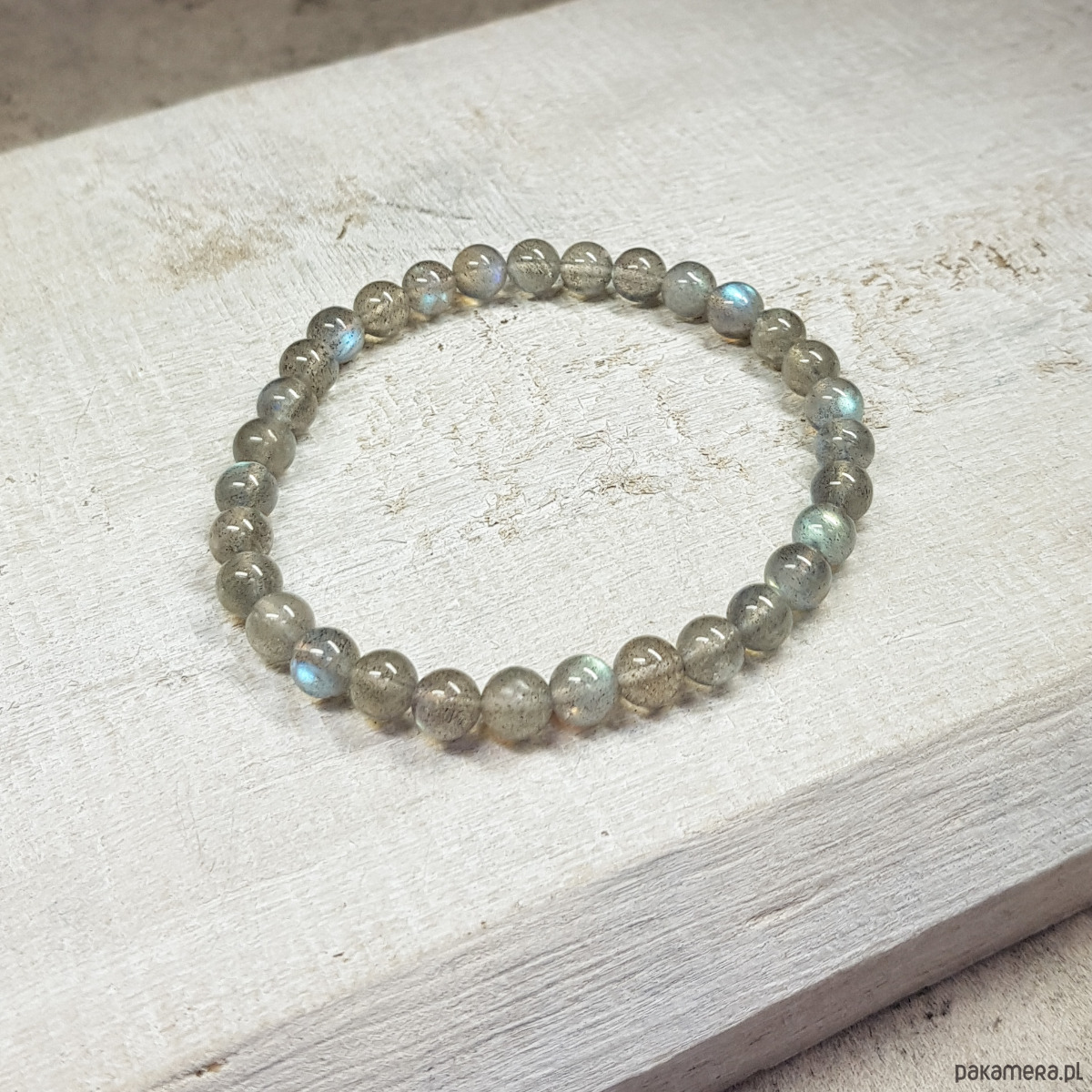 Bransoletka wykonana z wysokiej jakości kamieni labradorytów nawleczonych na silikonową gumkę. Kamienie o kształcie gładkiej kulki 6mm z silnym efektem iryzacji pięknie mienią się barwami granatu, błękitu i złota. Przedmiotem sprzedaży jest jeden sznur bransoletki. Bransoletka ma długość 18cm i pasuje na nadgarstek o obwodzie 16-17 cm.