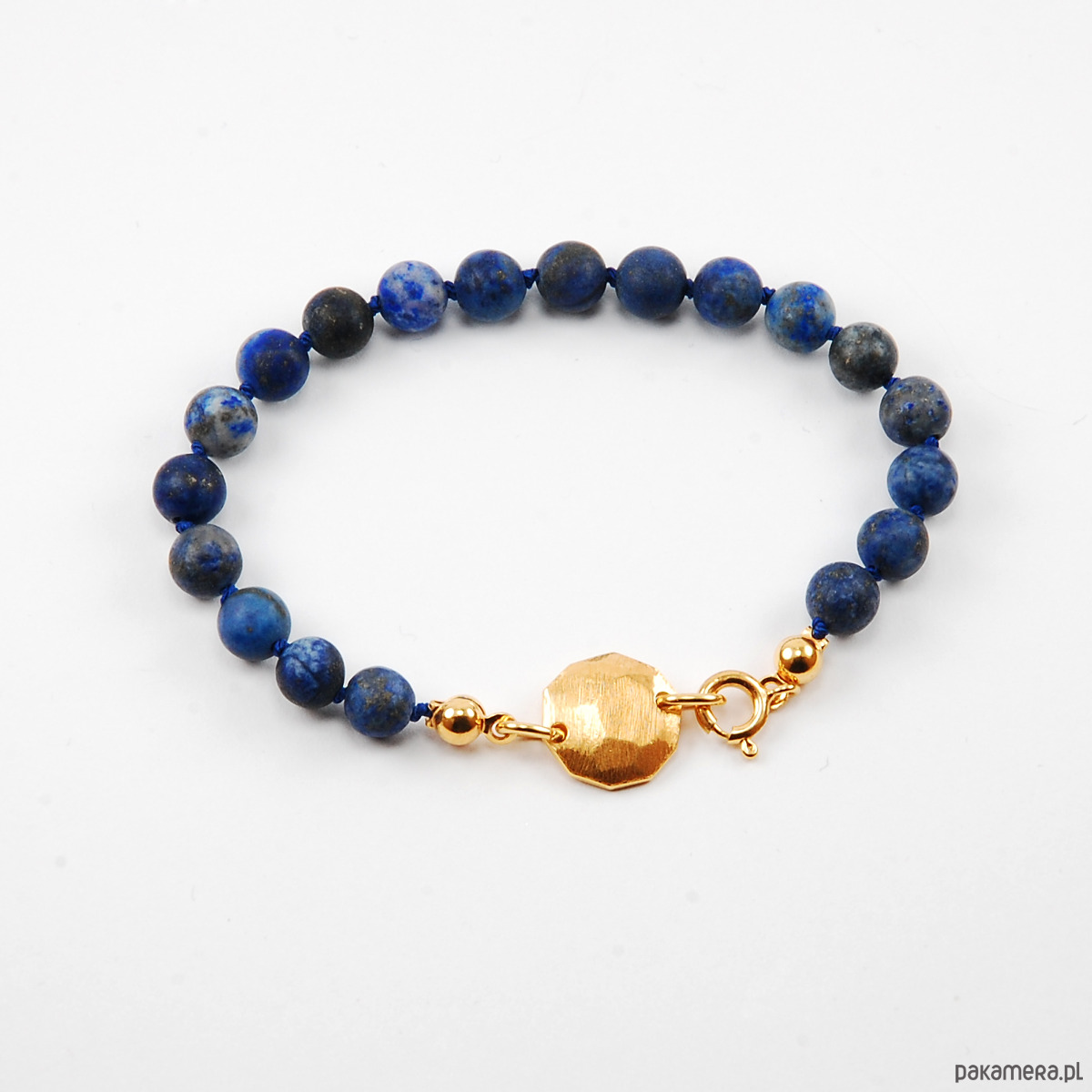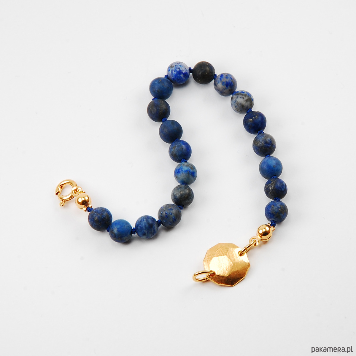 Elegancka bransoletka ze srebrnym medalionem oraz matowych kulek naturalnego kamienia lapis lazuli. Kuli lapisu są supełkowane na jedwabnej granatowej nici. Madalion został wykonany ze srebra próby 925 w matowym fasetowanym wykończeniu oraz pokryty żółtym złoceniem o grubości 2mikronów oraz zabezpieczony nanopowłoką. Długość bransoletki 17cm.
