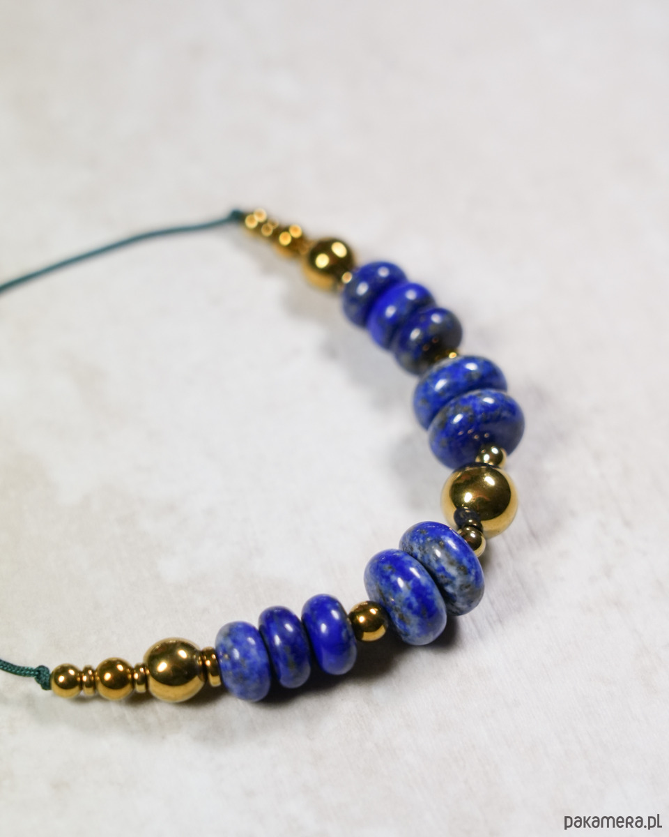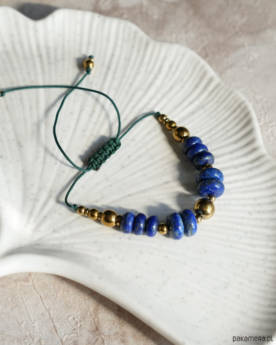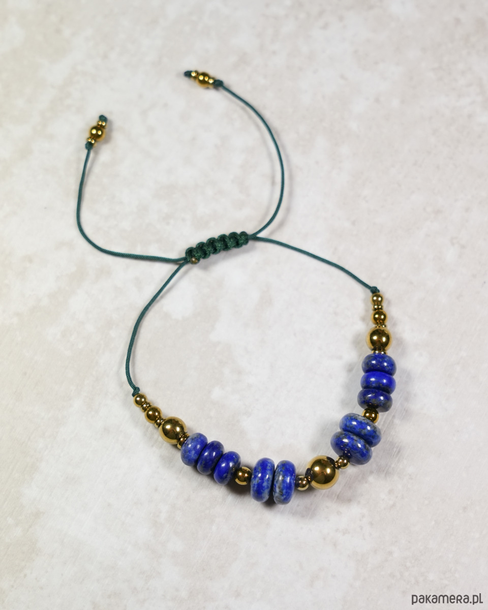 Bransoletka z kamieniami lapis lazuli i hematytem, nawleczonymi na mocny sznureczek w kolorze butelkowej zieleni. Bransoletka jest regulowana, dzięki czemu ma uniwersalny rozmiar. Będzie się super prezentować w połączeniu z innymi bransoletkami, nie tylko wykonanymi z minerałów, ale również złotymi.