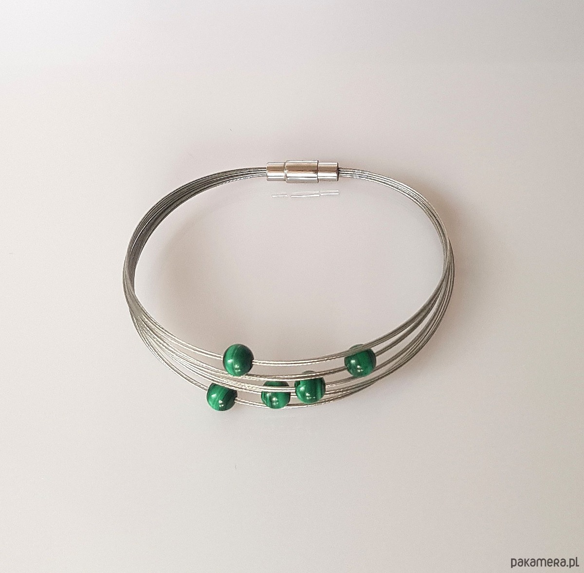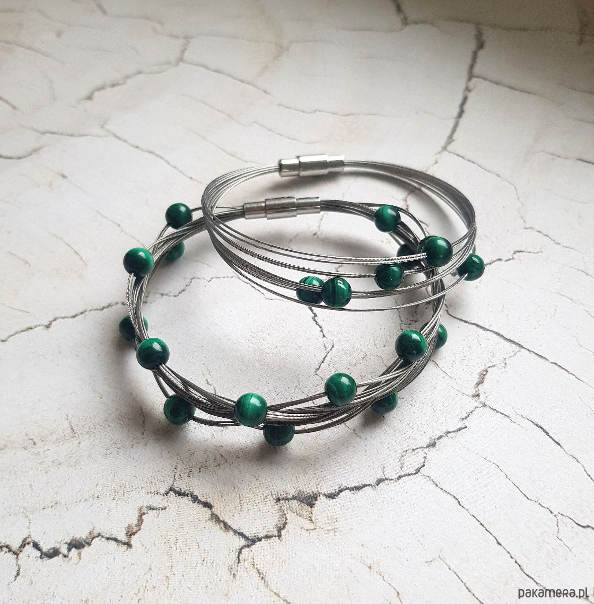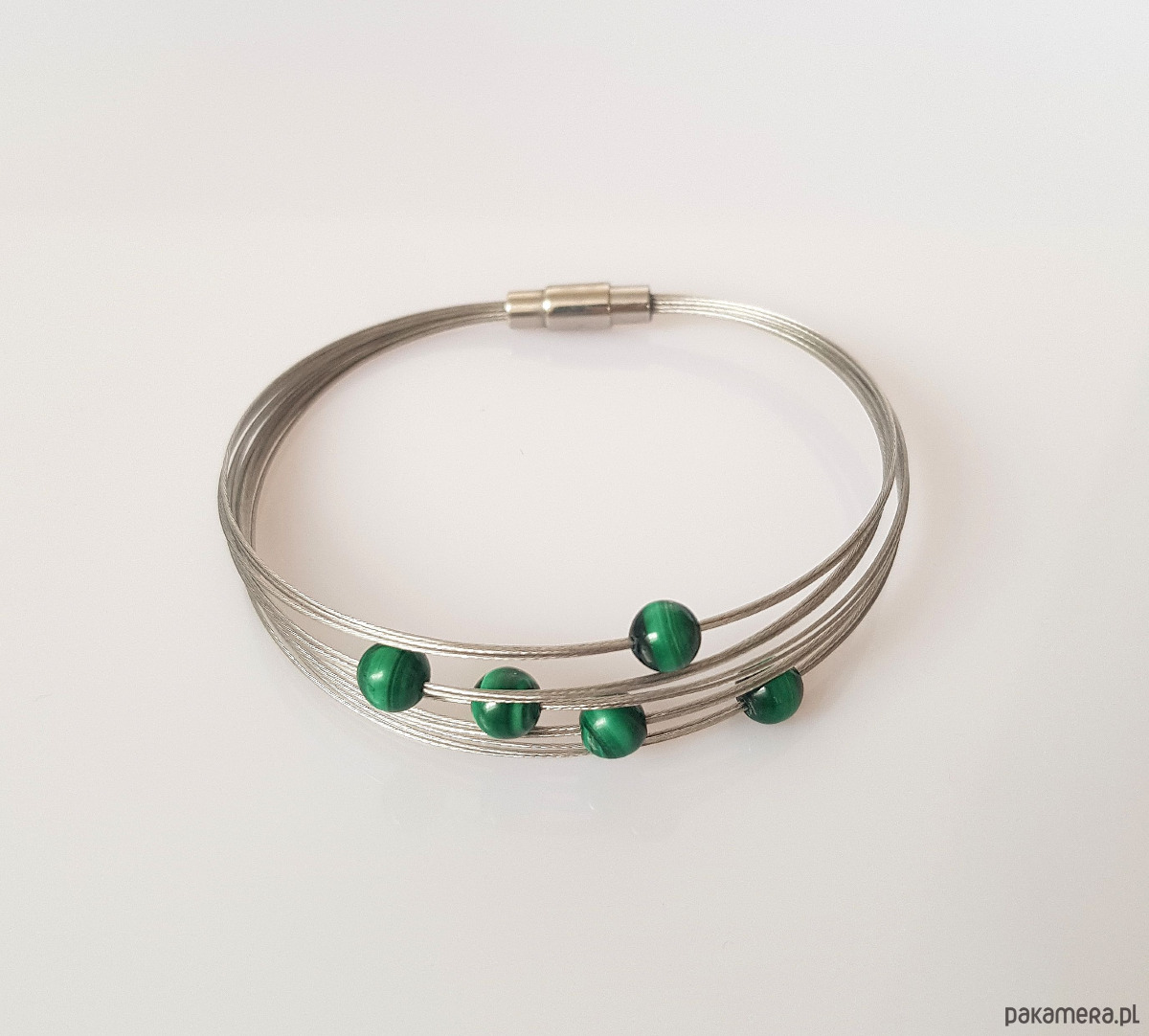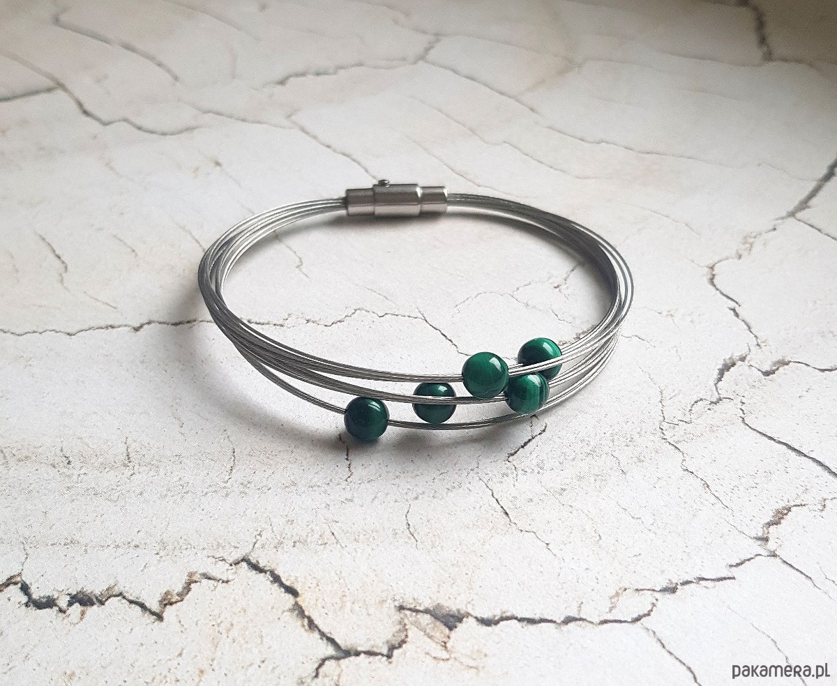 Elegancka bransoletka zapleciona na lince jubilerskiej z gładkich kulek malachitu.