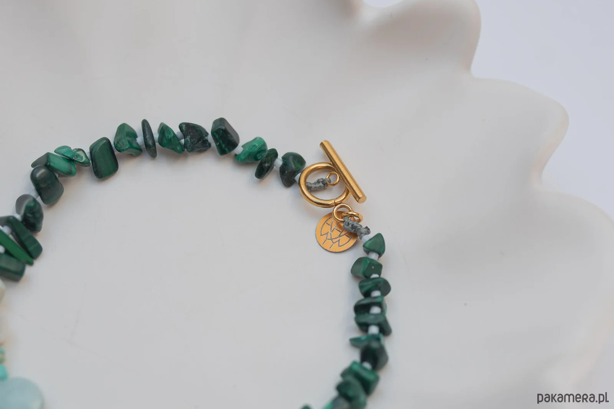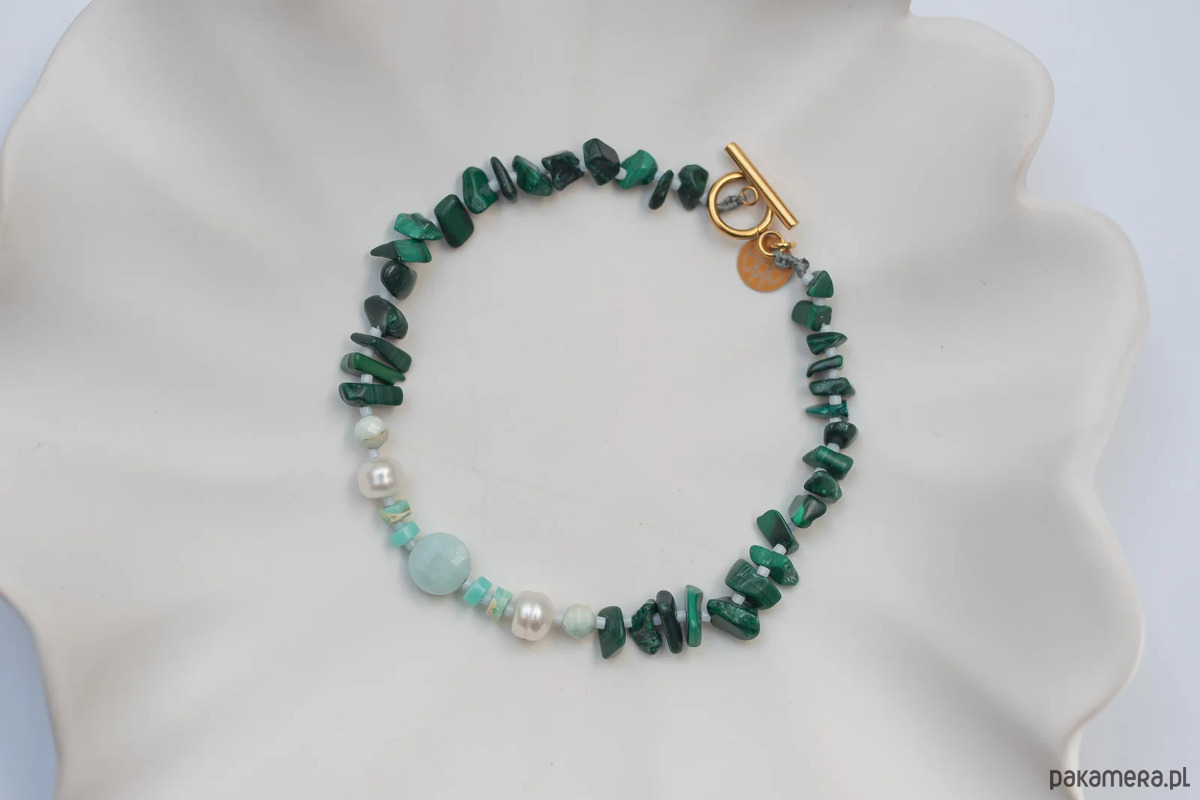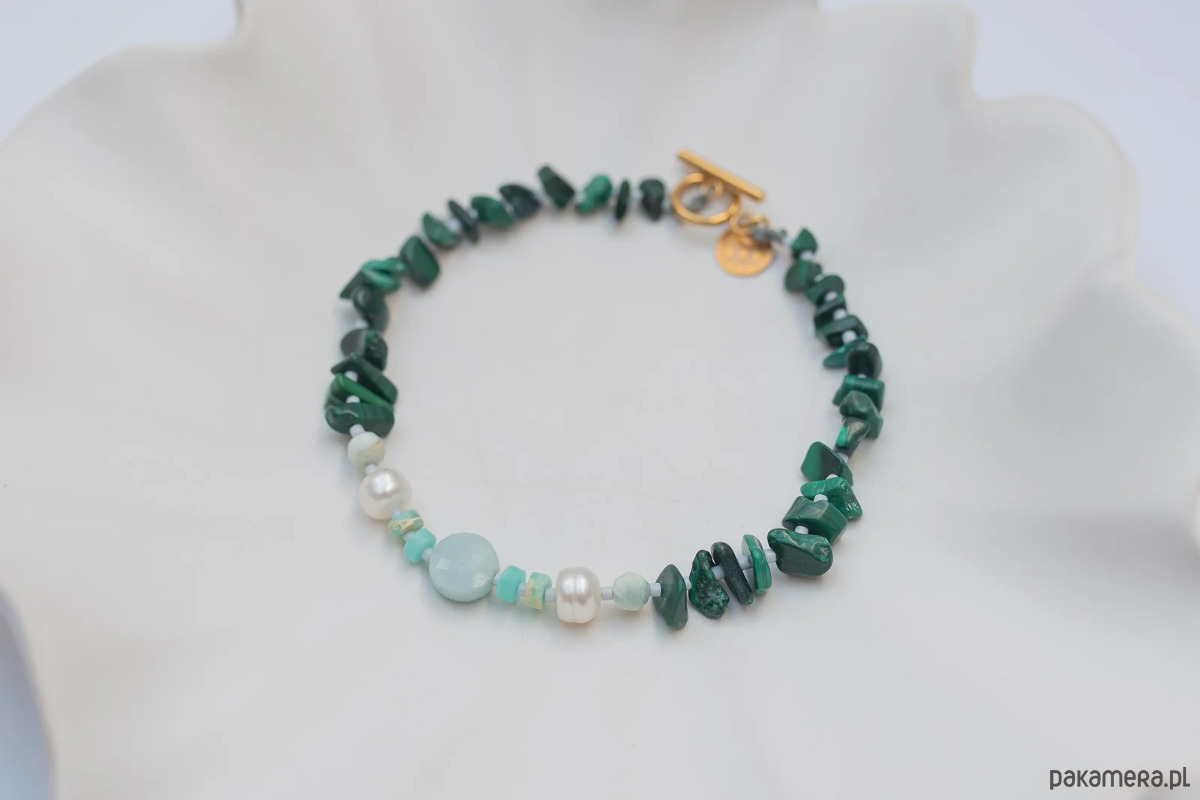 Użyte materiały: Malachit, Amazonit, Jaspis Cesarski, Perła Nylon, Stal Chirurgiczna.