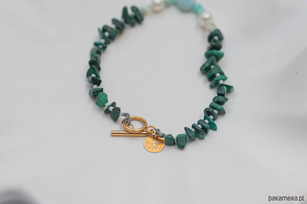 Bransoletka z Malachitu Amazonitu i Pereł stworzyliśmy ręcznie tak aby jej najwyższej połączyć surową formę biżuterii z przepięknym eleganckim wyglądem. Efekt ten uzyskaliśmy poprzez idealne ułożenie surowych Malachitów o delikatnym szlifie, które połączyliśmy z Amazonitem, Perłą oraz Jaspisem Cesarskim. Moc koloru oraz wyjątkowa faktura zaklęta w biżuterii. Wybierz kolor wykończenia w postaci zapięcia, aby dopasować kompozycję idealnie do Ciebie!