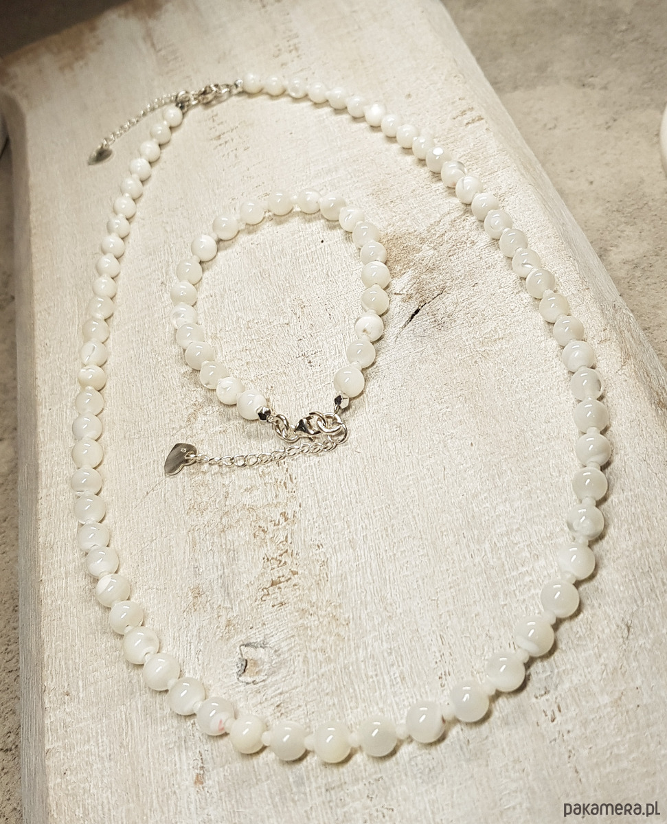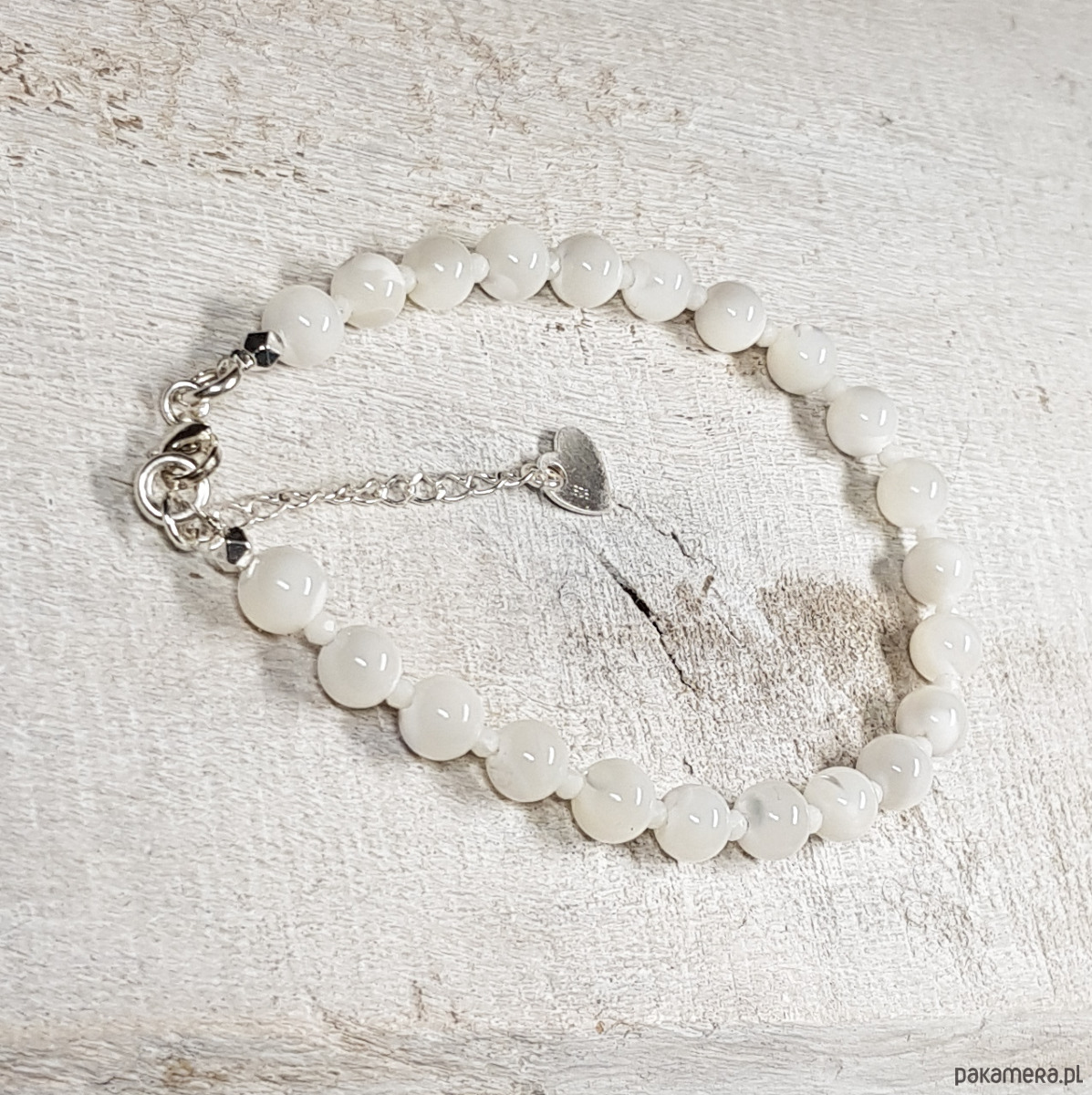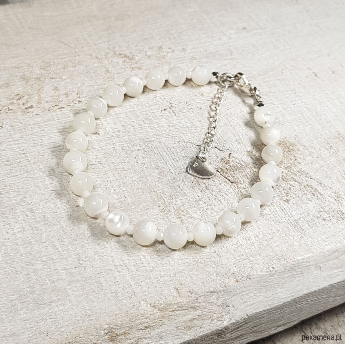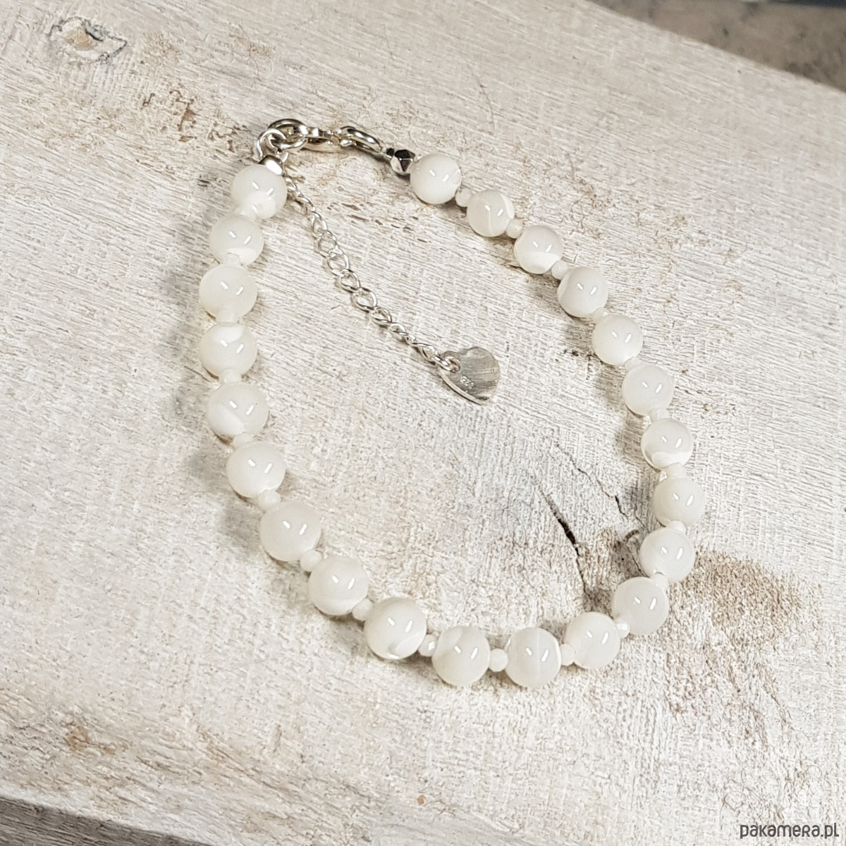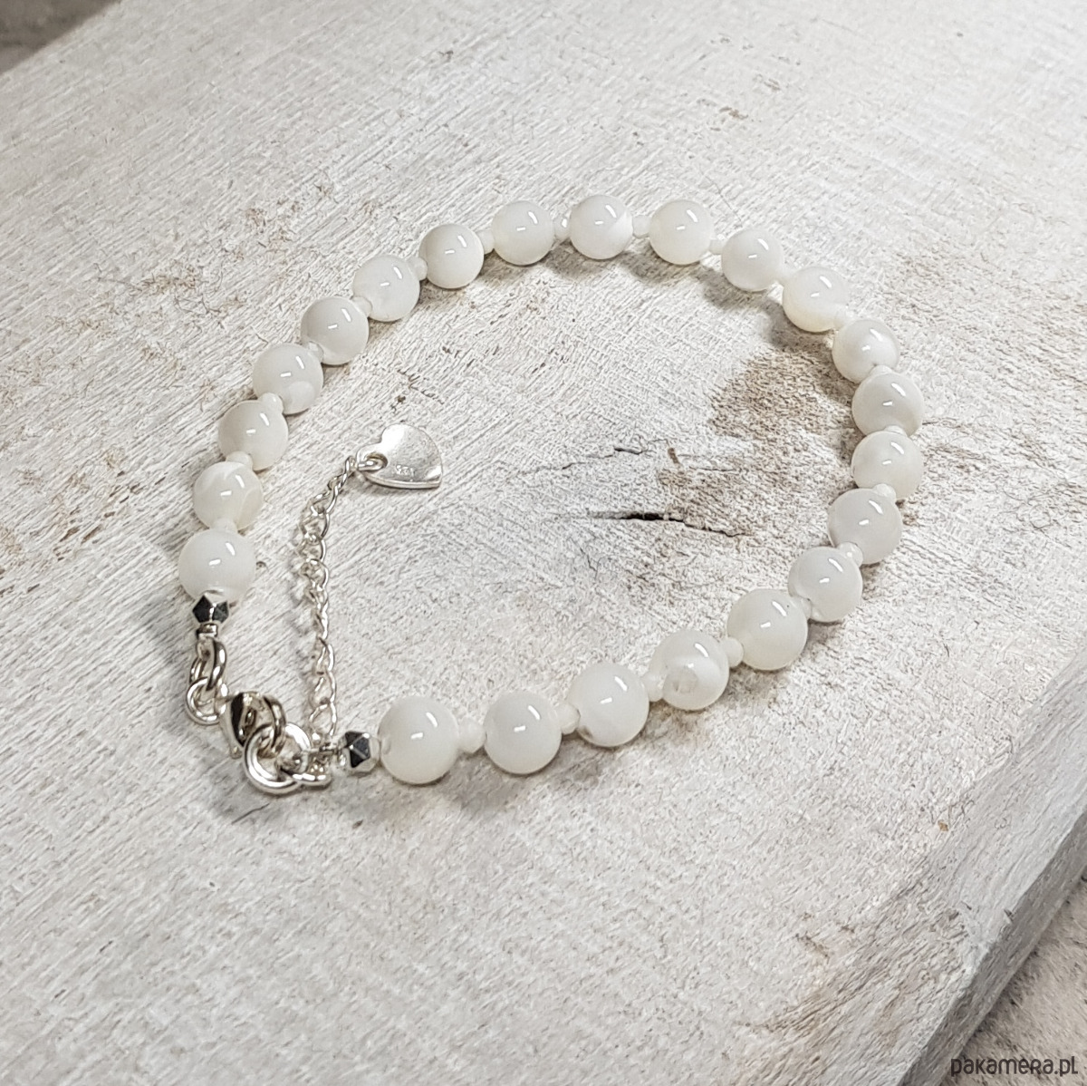 Bransoletka wykonana z koralików z białej masy perłowej 5mm. Wykończenia i zapięcie wykonane w srebrze 925. Długość bransoletki wynosi ok. 19 cm plus przedłużka 3cm.