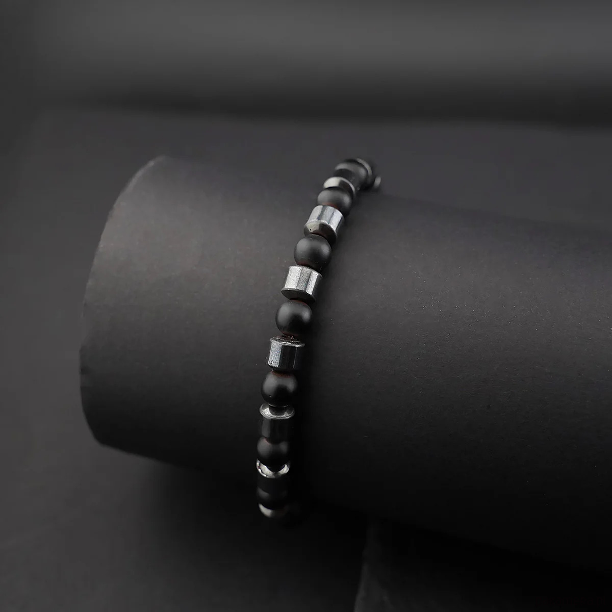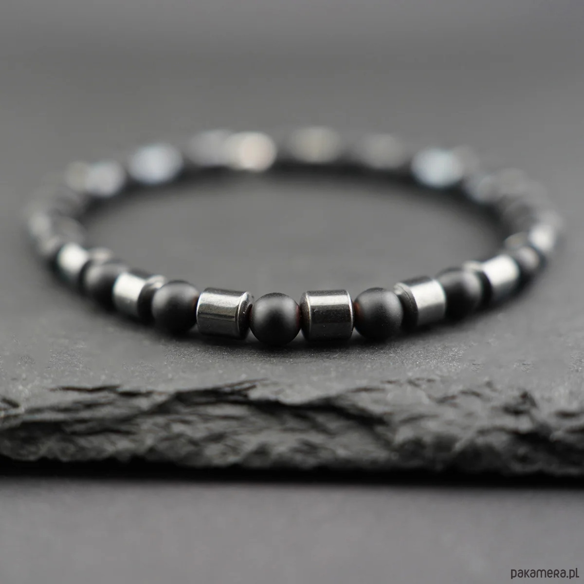 Wyrazista i stylowa – ta bransoletka łączy matowe kule onyksu z połyskującymi walcami hematytu w srebrnym odcieniu. Kontrast głębokiej czerni i metalicznego blasku tworzy wyjątkowy, nowoczesny dodatek, który podkreśli zarówno codzienny, jak i bardziej formalny look.