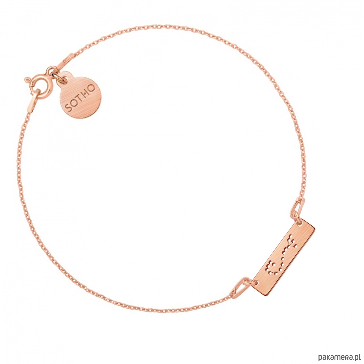 Złota bransoletka łańcuszkowa zdobiona konstelacją zodiakalną Skorpiona i zawieszką z logo marki. Całość wykonana ze srebra 925 powlekanego 18 karatowym różowym złotem.