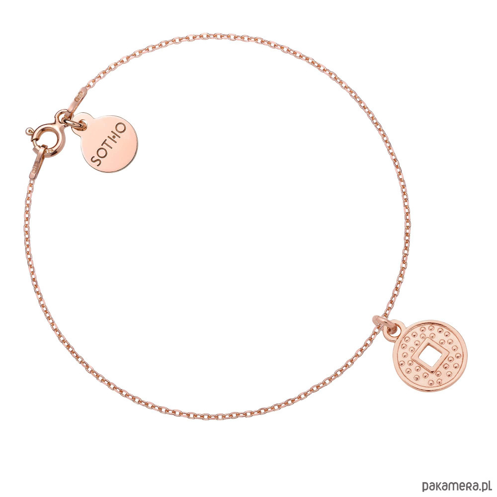 Złota bransoletka łańcuszkowa z monetą i zawieszką z logo marki. Całość wykonana ze srebra 925 powlekanego 18 karatowym różowym złotem.