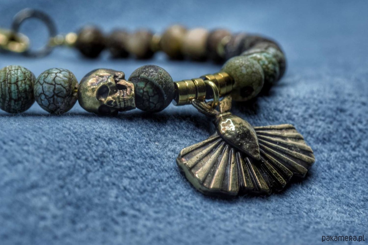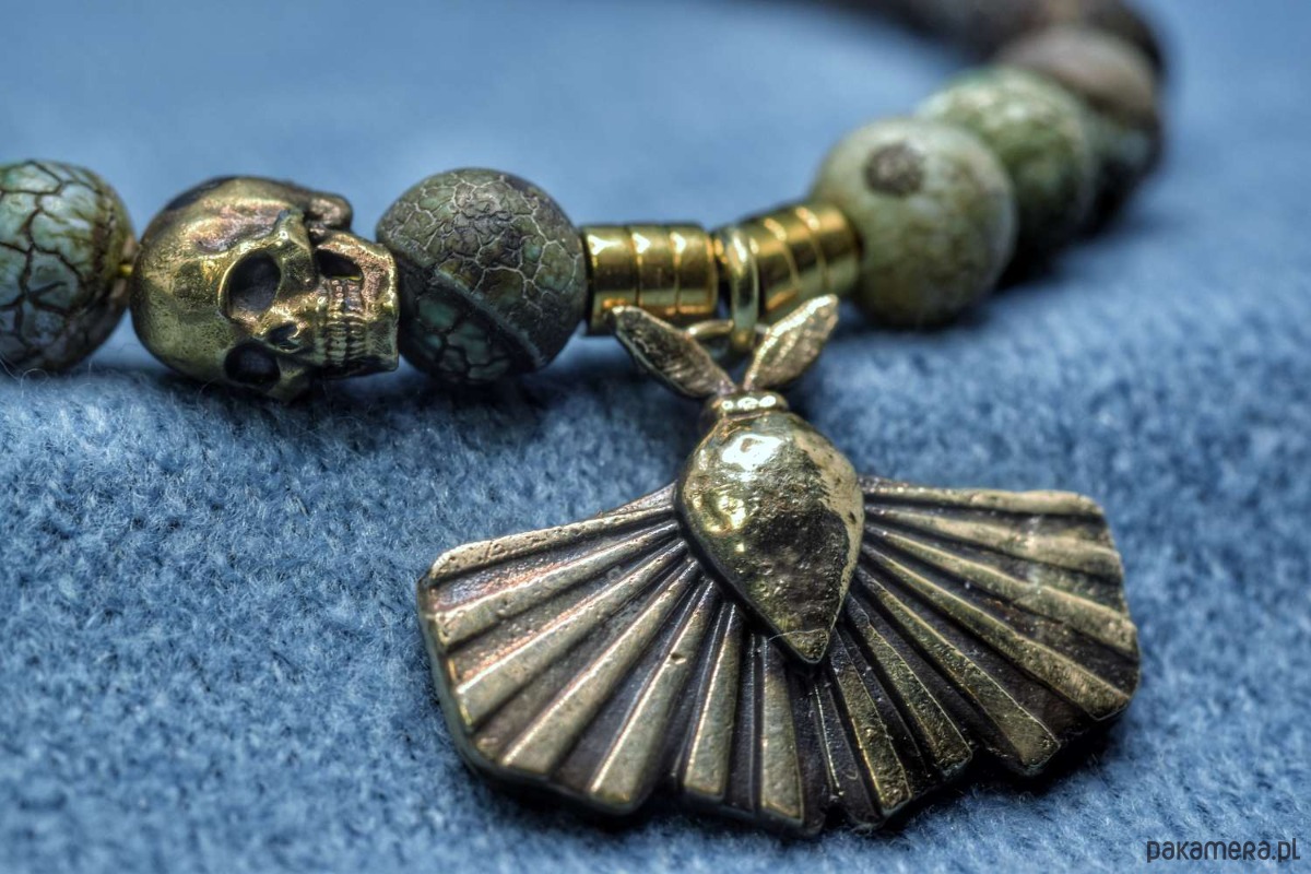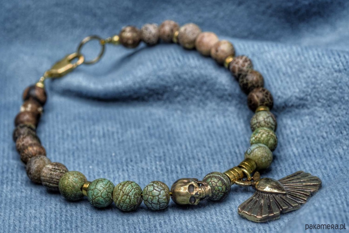 Bransoletka złożona z turkusu afrykańskiego z dwoma zaieszkami własnego projektu. Obie zawieszki zostały odlane w brązie. Ćma pochodzi z projektu "Ćmy. Między nocą a dniem". Z kolei czaszeczka to... po prostu czaszeczka, ale uznałem, że dobrze się razem komponują.