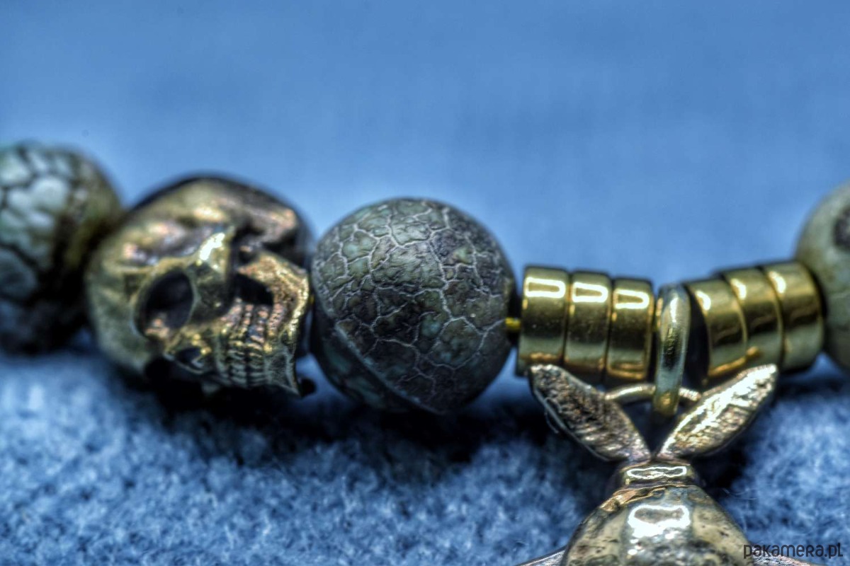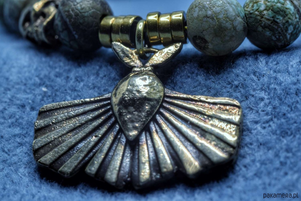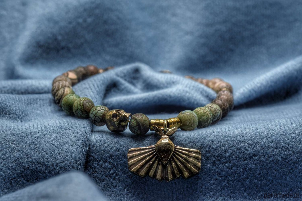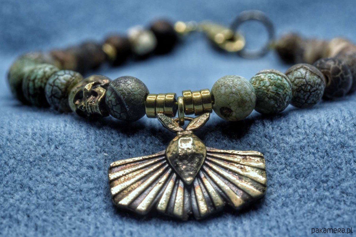 Bransoletka złożona z turkusu afrykańskiego z dwoma zaieszkami własnego projektu. Obie zawieszki zostały odlane w brązie. Ćma pochodzi z projektu "Ćmy. Między nocą a dniem". Z kolei czaszeczka to... po prostu czaszeczka, ale uznałem, że dobrze się razem komponują.