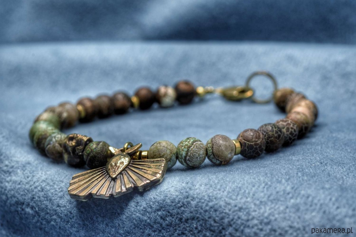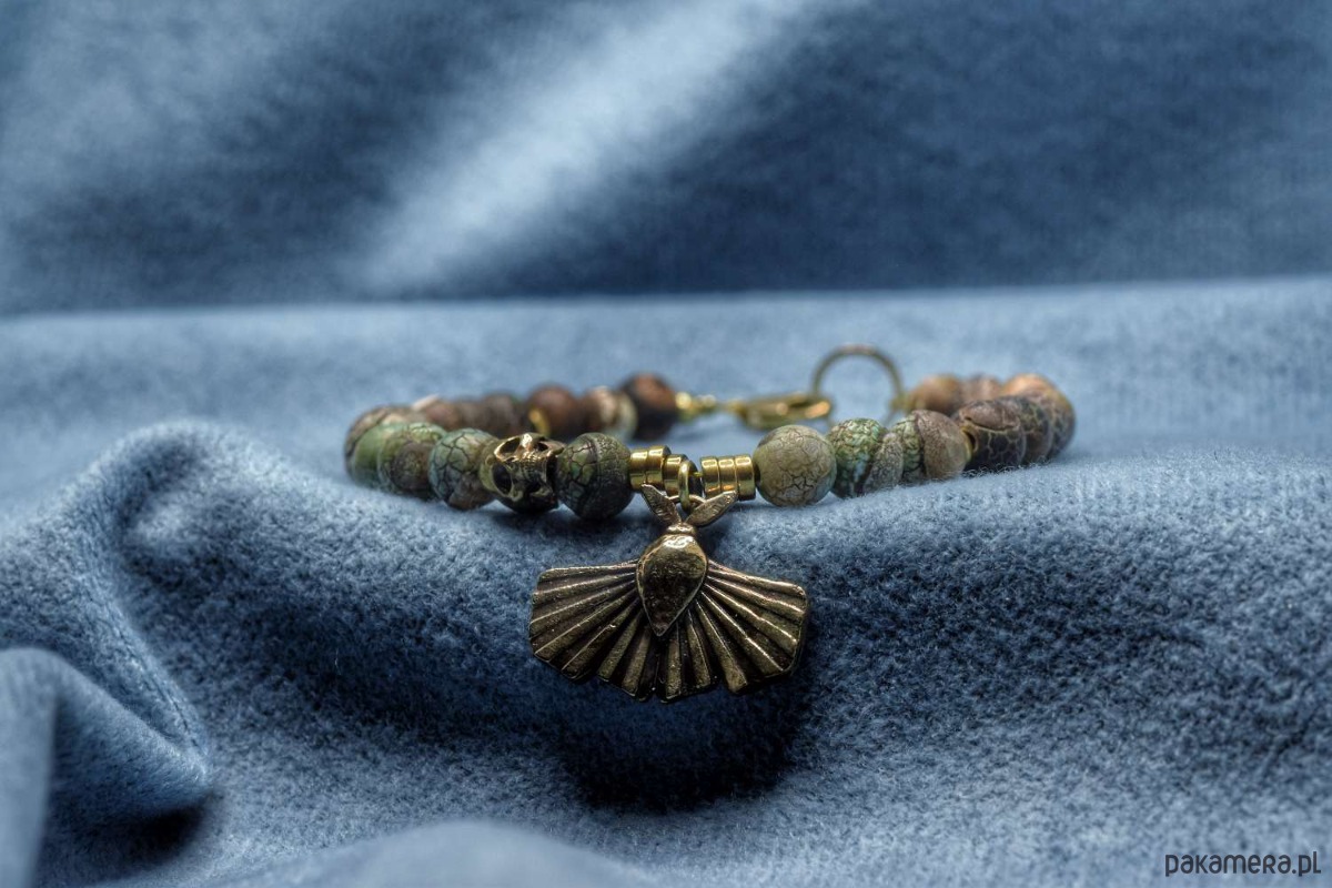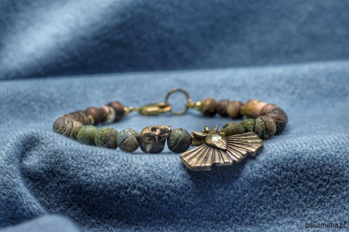 Bransoletka z naturalnych kamieni z ćmą i czaszeczką z brązu