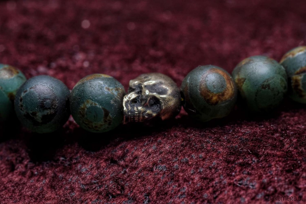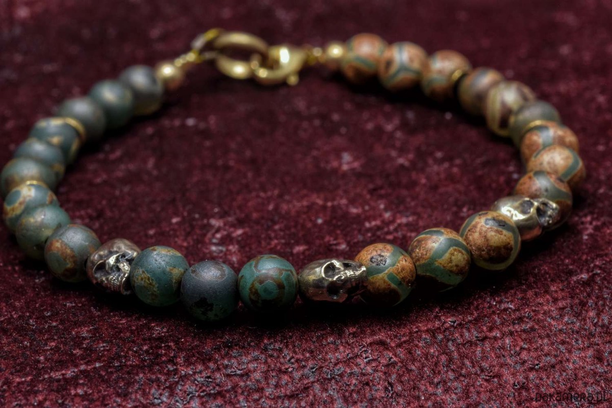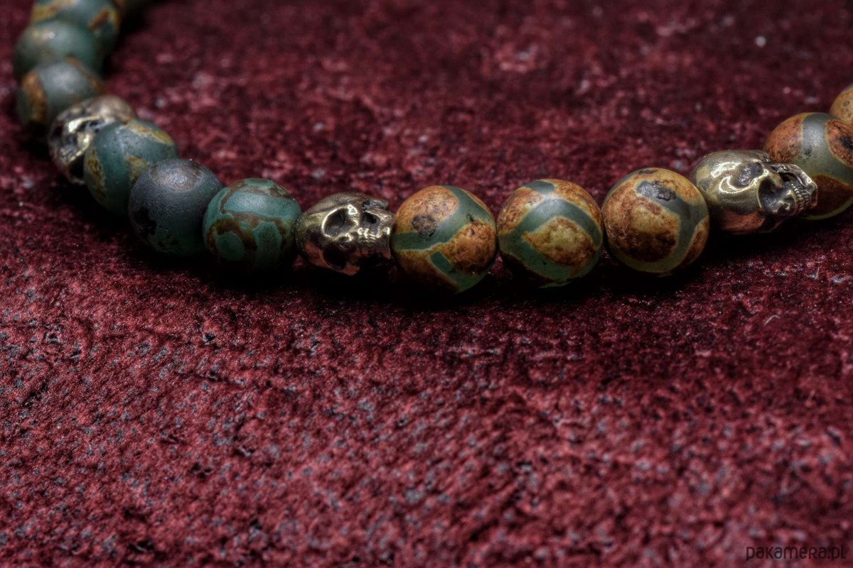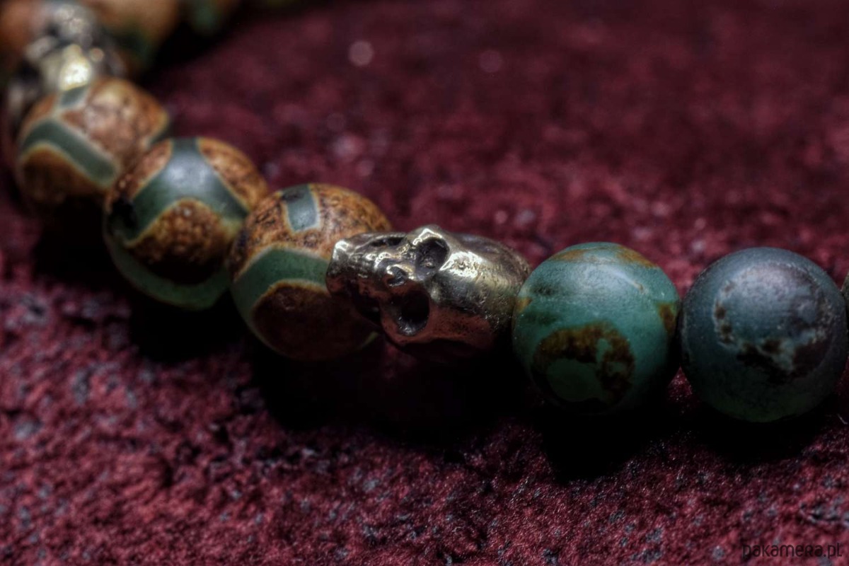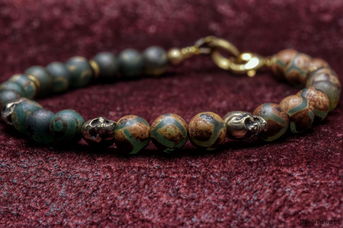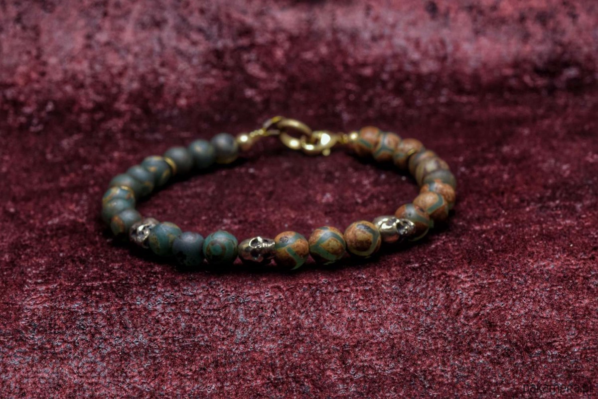 Bransoletka złożona z agatu tybetańskiego z czaszkami z brązu własnego projektu.