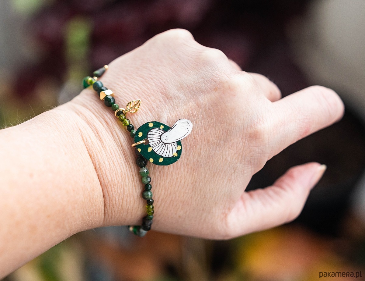 Ręcznie wykonana zawieszka grzybka sprawia, że bransoletka jest niepowtarzalna.
