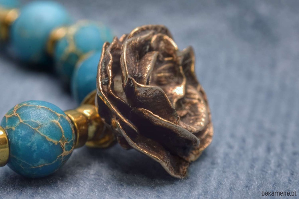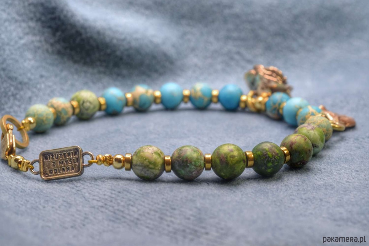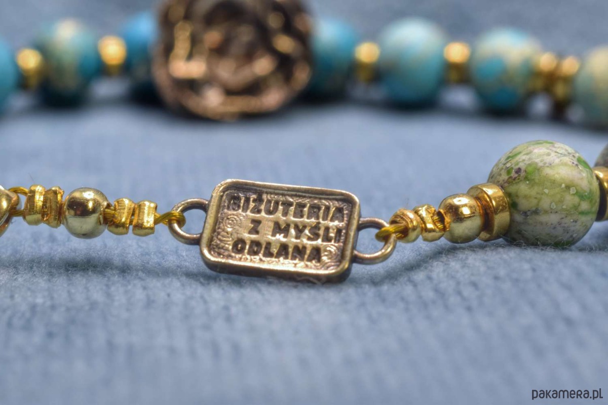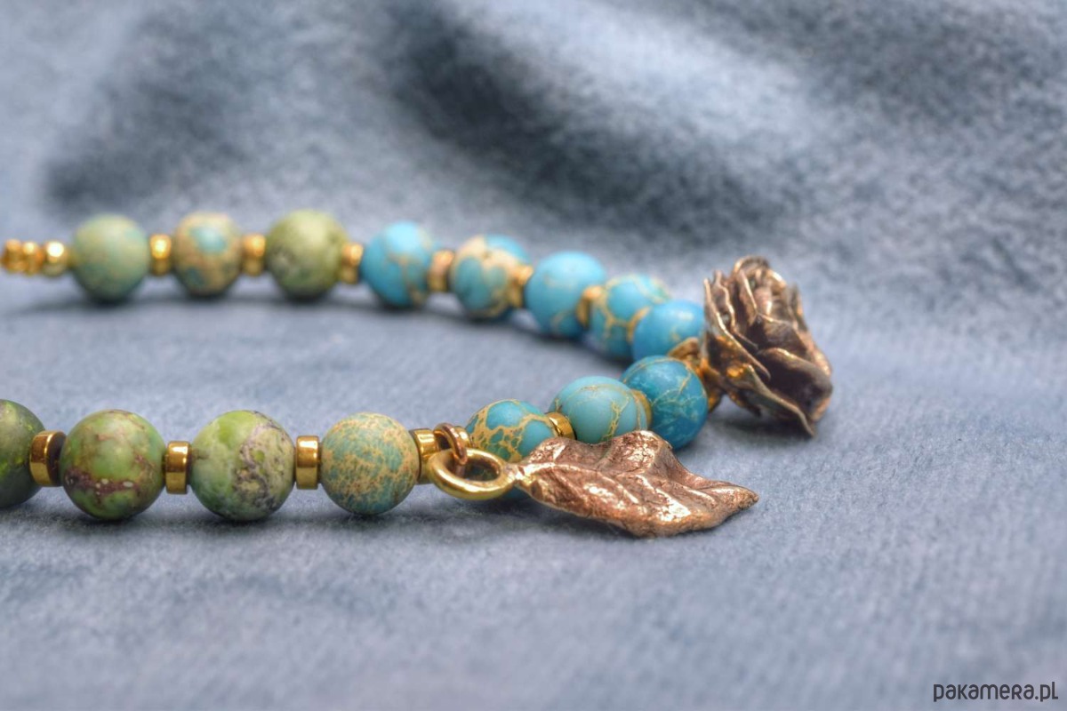 Zielono-niebieska z naturalnych kamieni z dwoma zawieszkami z brązu własnego projektu (różyczka i listek.)