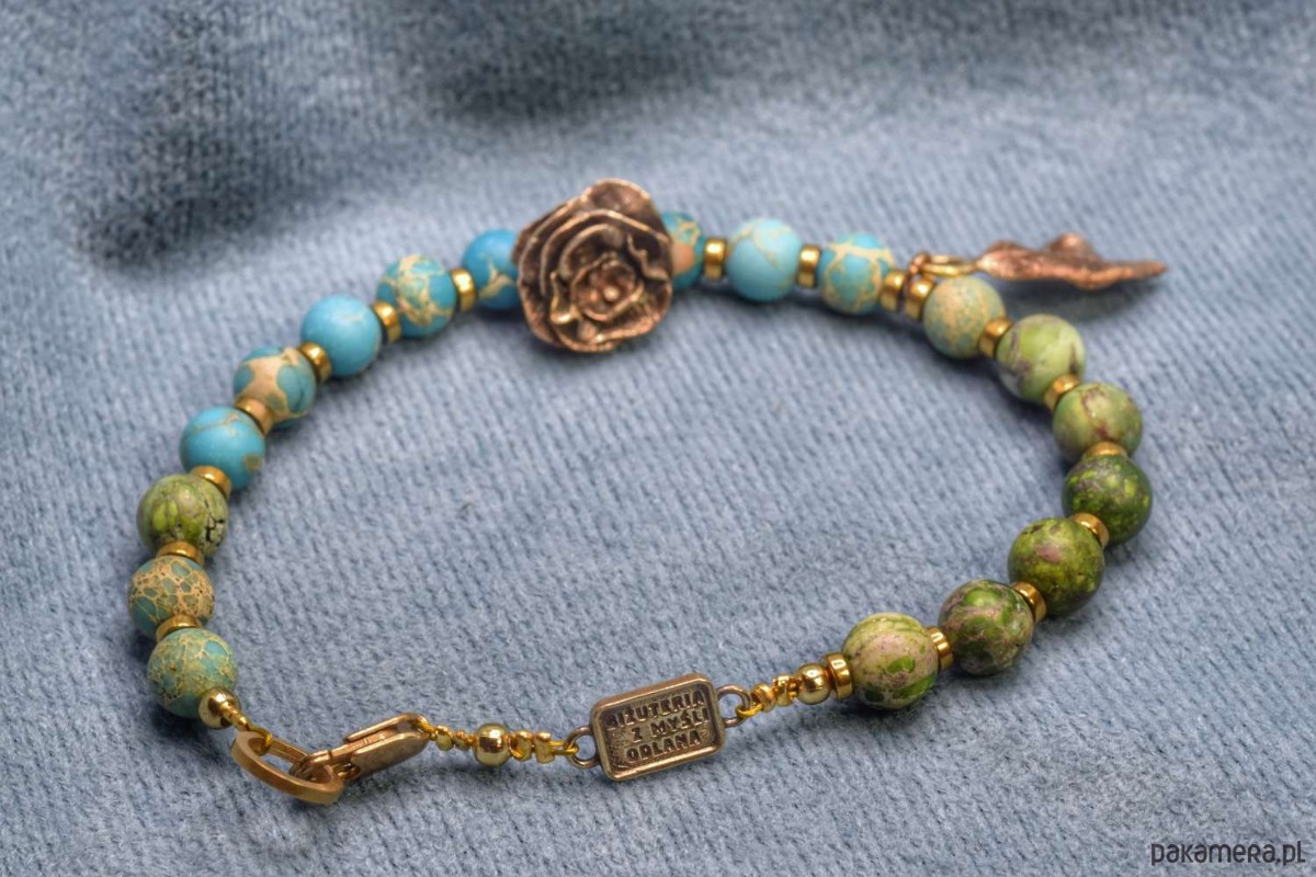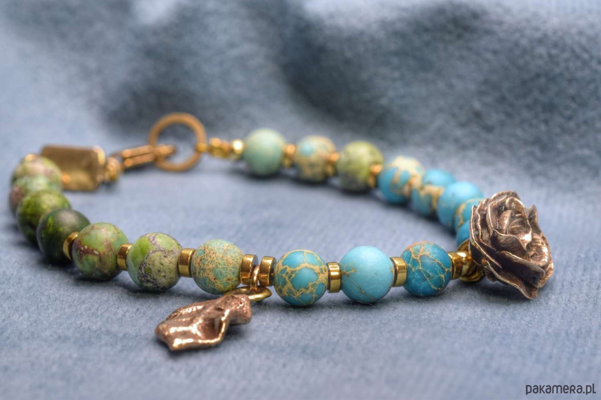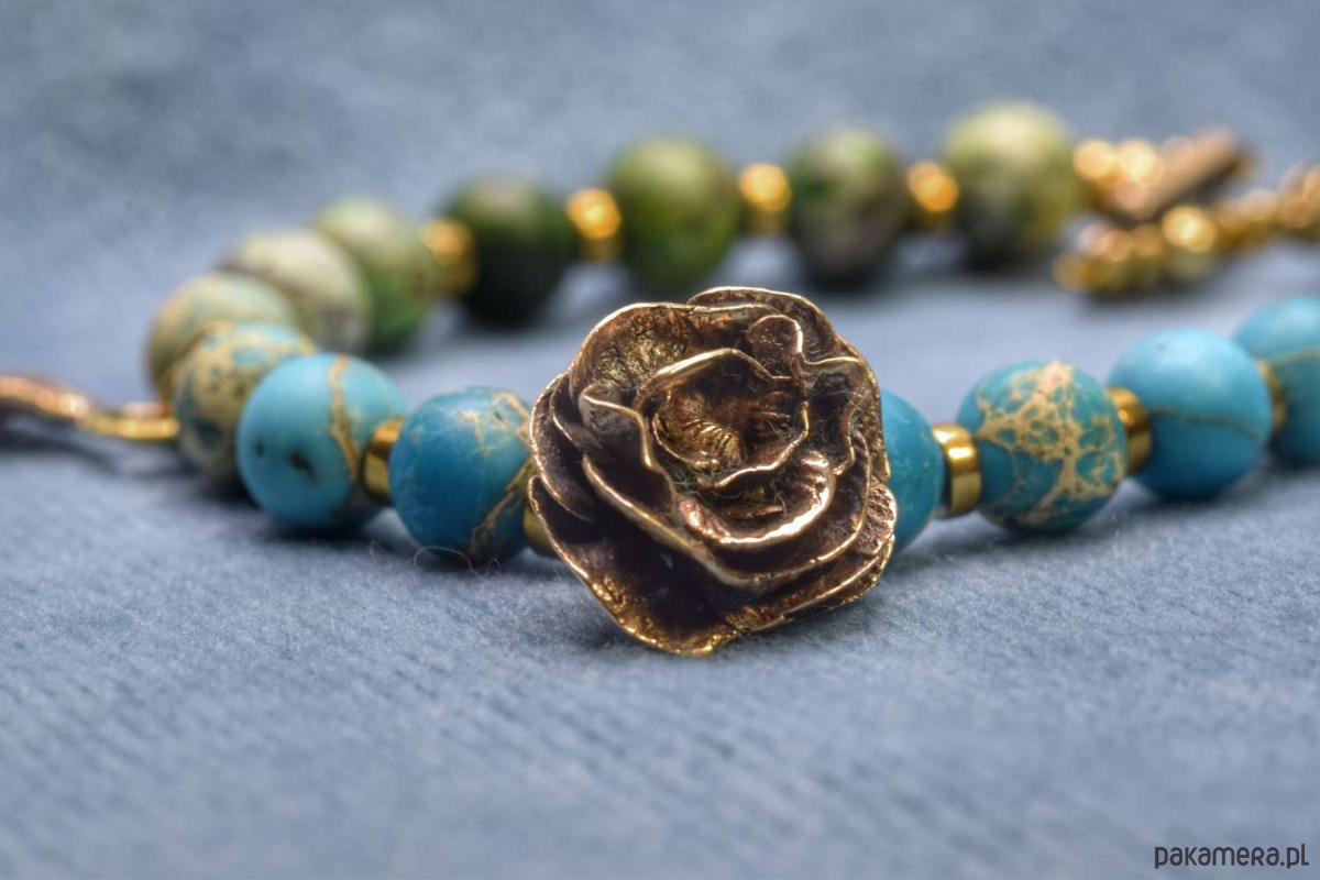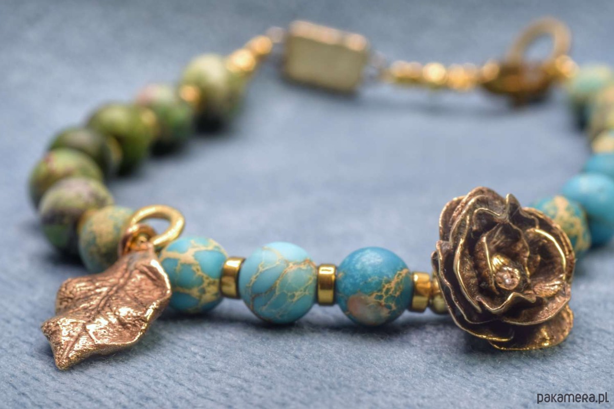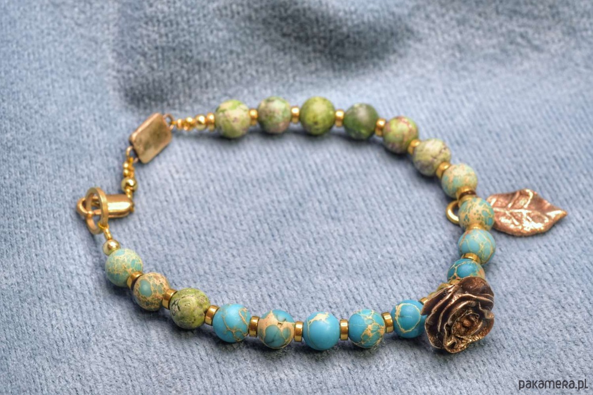 Bransoletka z naturalnych kamieni z różyczką i liściem z brązu