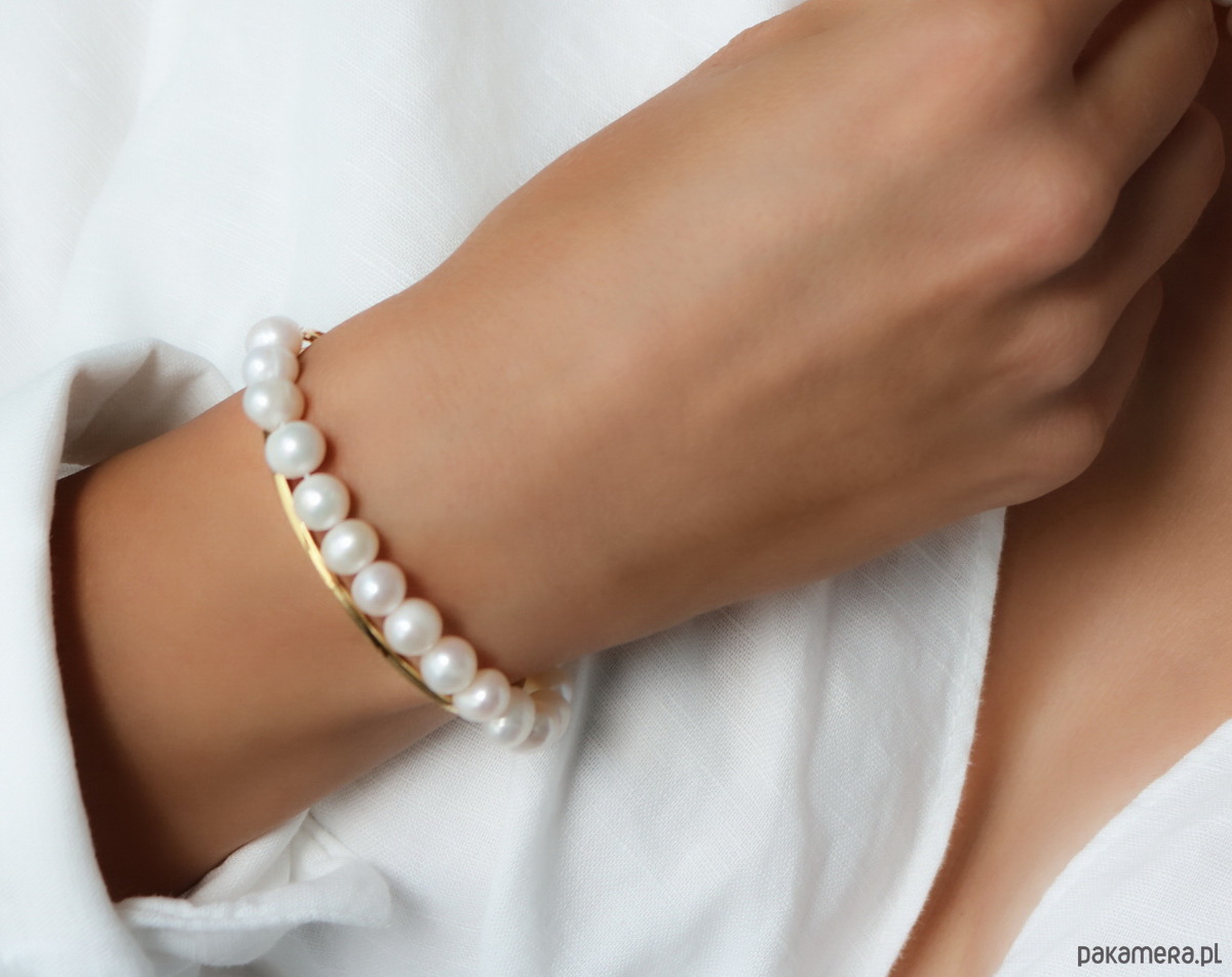 Wyrafinowana bransoletka z naturalnych pereł słodkowodnych, o gładkiej i lśniącej powierzchni, która emanuje subtelnym blaskiem.