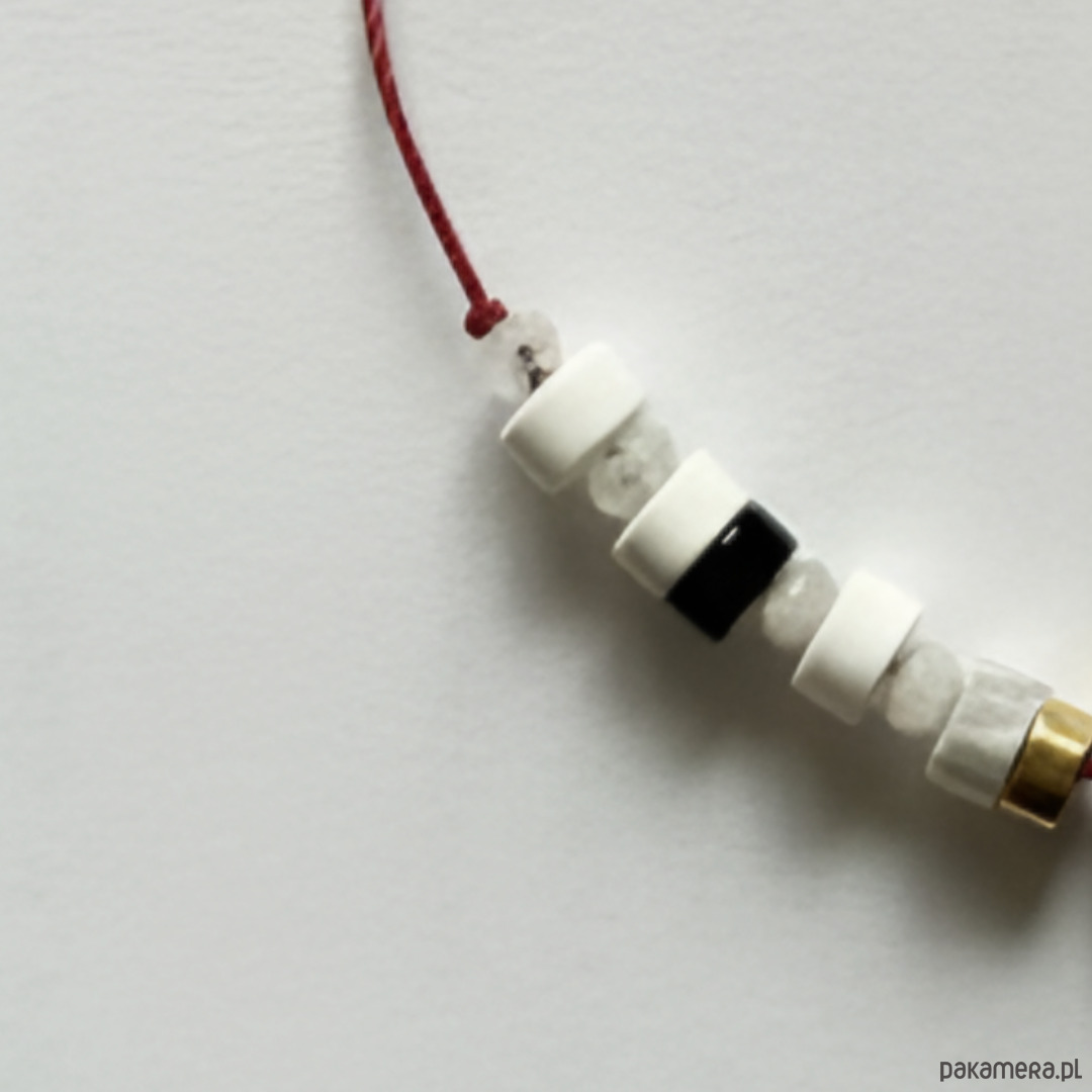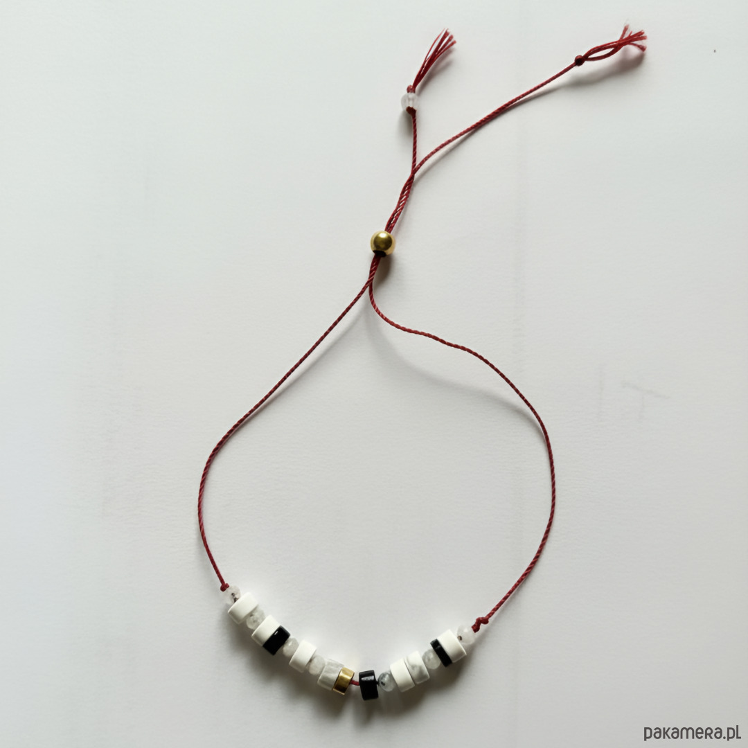 Bransoletka na jedwabnej czerwonej nici, a regulację umożliwia kuleczka z silikonem, która płynnie przesuwa się po nitce.