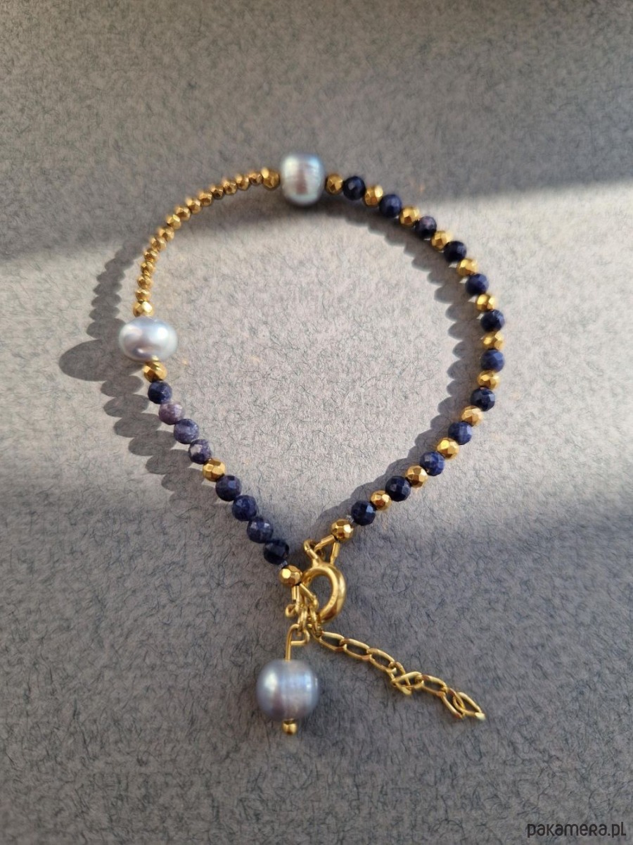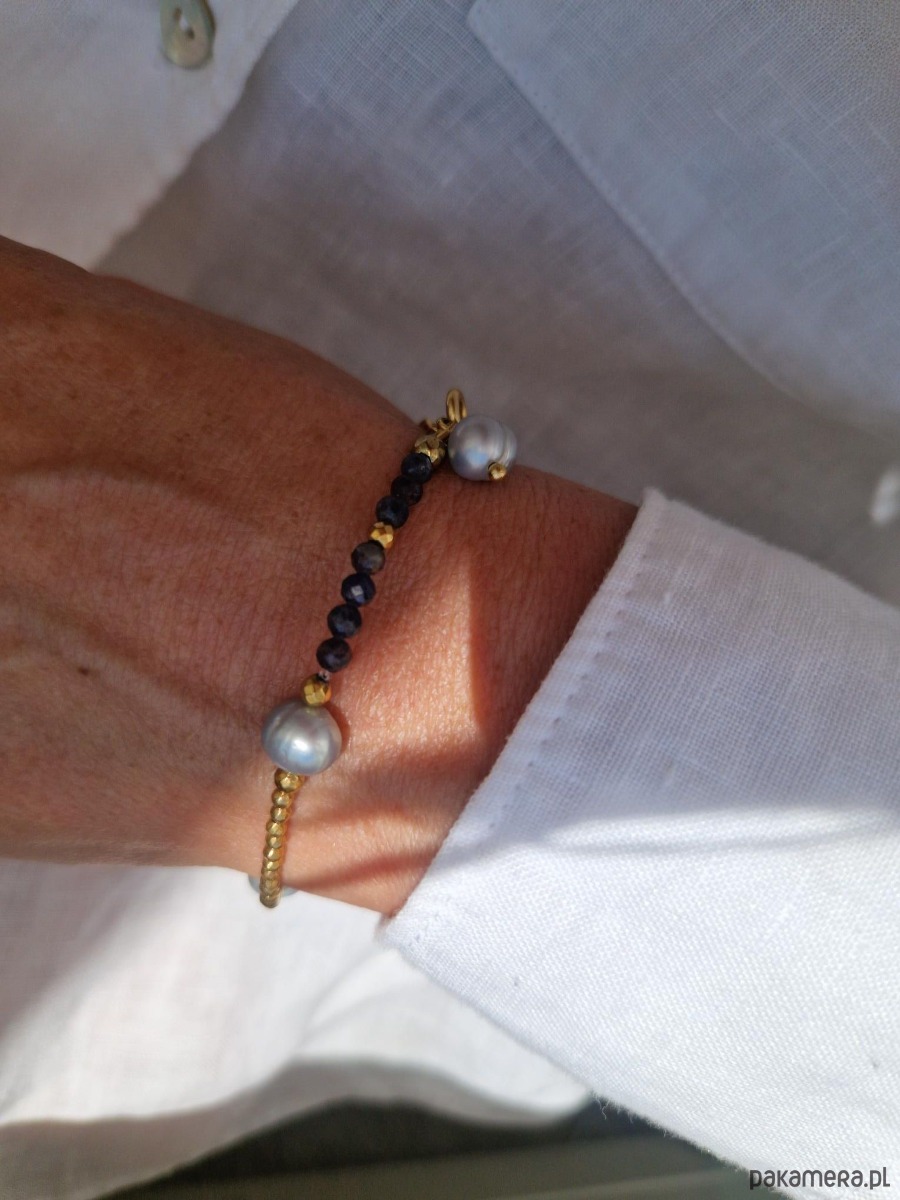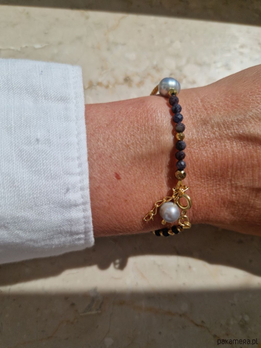 Bransoletka wykonana ręcznie z królewskich kamieni - niebieskich szafirów i szarych, naturalnych pereł i pozłacanych hematytów. Abstrakcyjny projekt bransoletki dopełnia zawieszka z szarej perły i łańcuszek. Bransoletka bije niezwykłym blaskiem, a jej walory można docenić na żywo. Elegancki dodatek do wielu stylizacji, białych koszul, granatowych jeansów, szarych marynarek, różowych bluz. W innej ofercie znajdziesz naszyjnik do kompletu, widoczny na ostatnim zdjęciu.