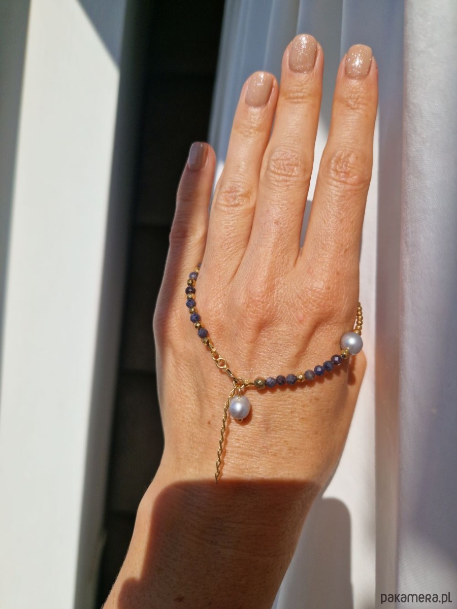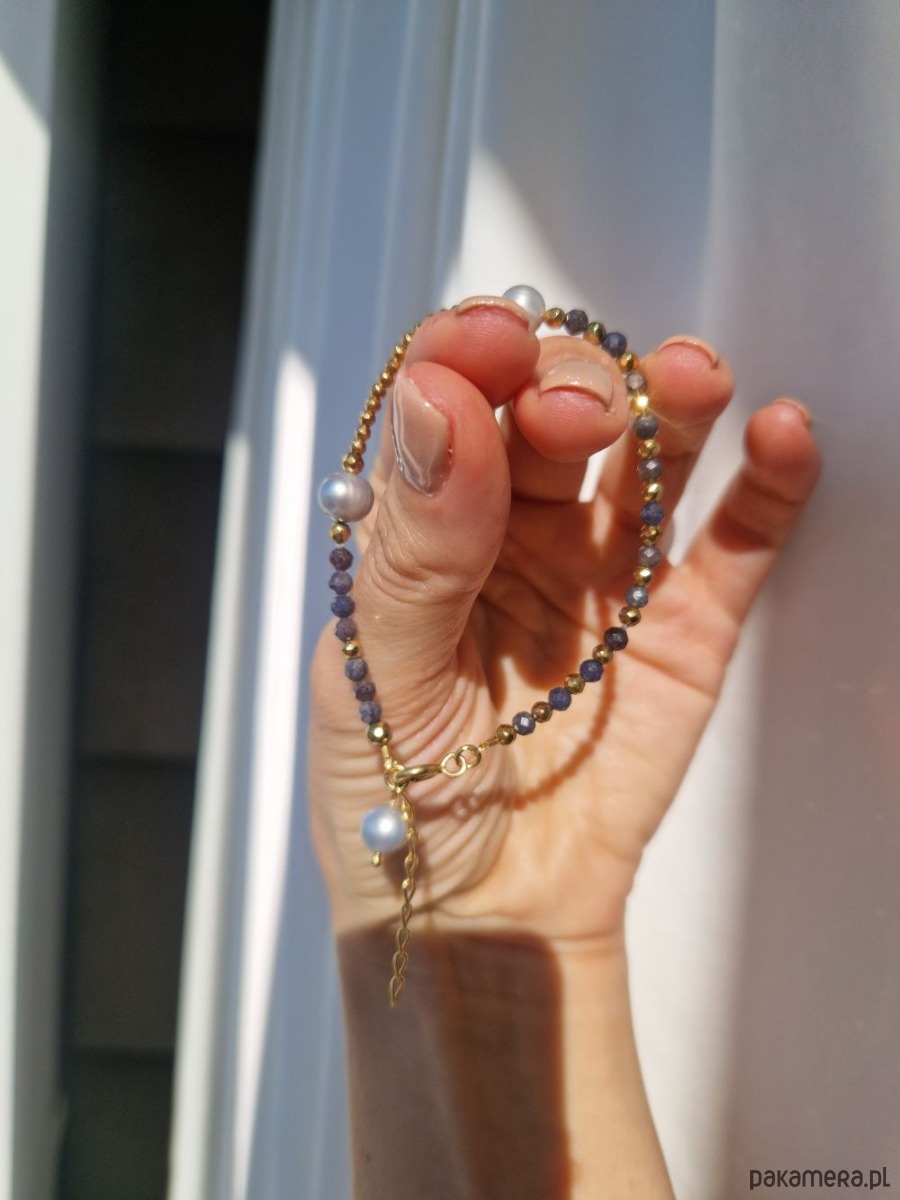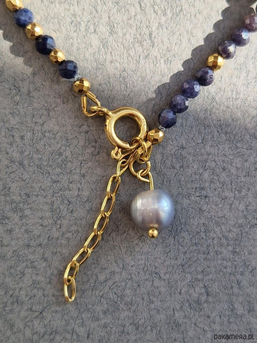 Bransoletka wykonana ręcznie z królewskich kamieni - niebieskich szafirów i szarych, naturalnych pereł i pozłacanych hematytów. Abstrakcyjny projekt bransoletki dopełnia zawieszka z szarej perły i łańcuszek. Bransoletka bije niezwykłym blaskiem, a jej walory można docenić na żywo. Elegancki dodatek do wielu stylizacji, białych koszul, granatowych jeansów, szarych marynarek, różowych bluz. W innej ofercie znajdziesz naszyjnik do kompletu, widoczny na ostatnim zdjęciu.