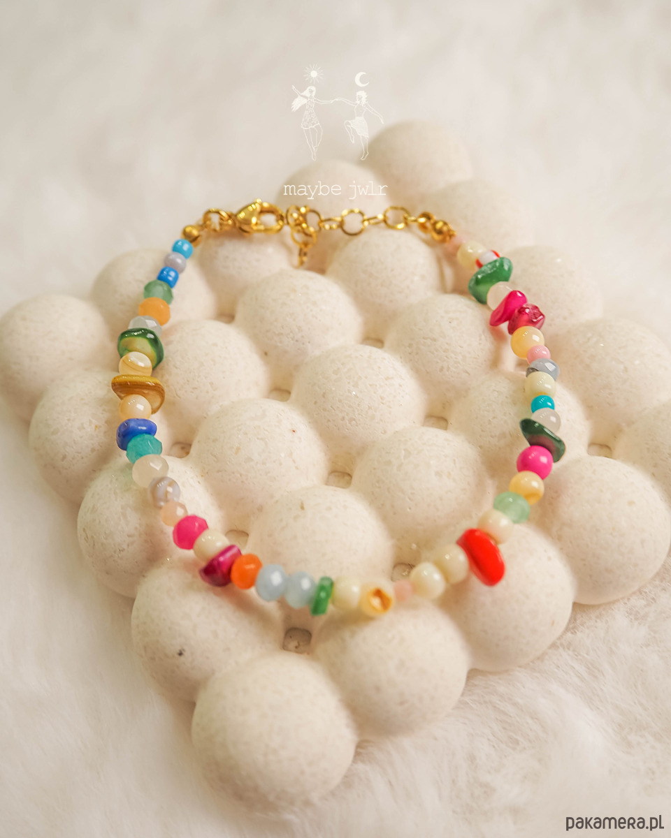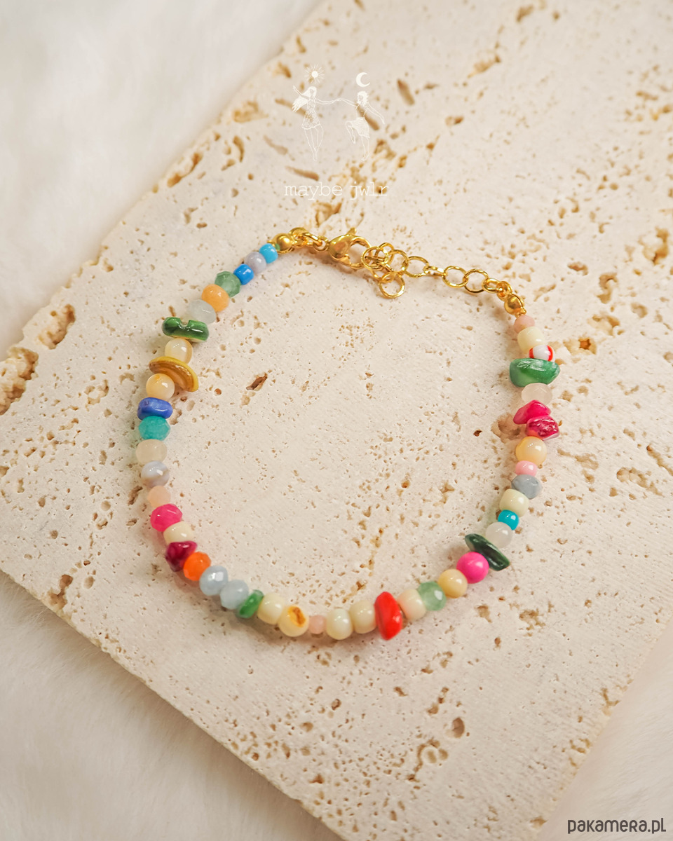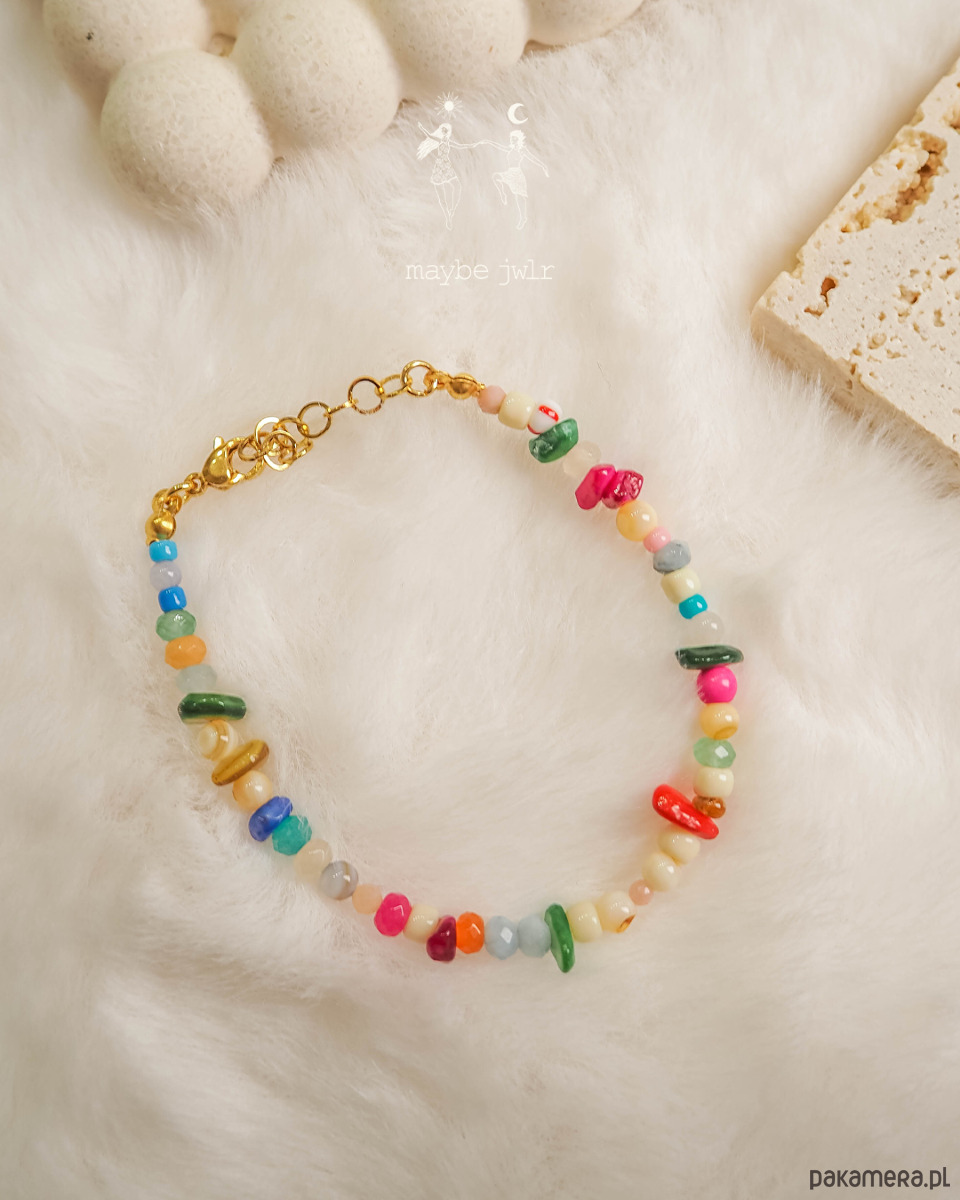 Bransoletka z nieregularnych kolorowych kamieni i koralików.