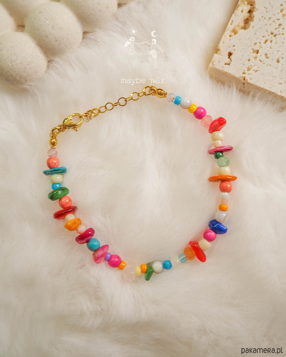 Bransoletka z nieregularnych kolorowych kamieni i koralików.