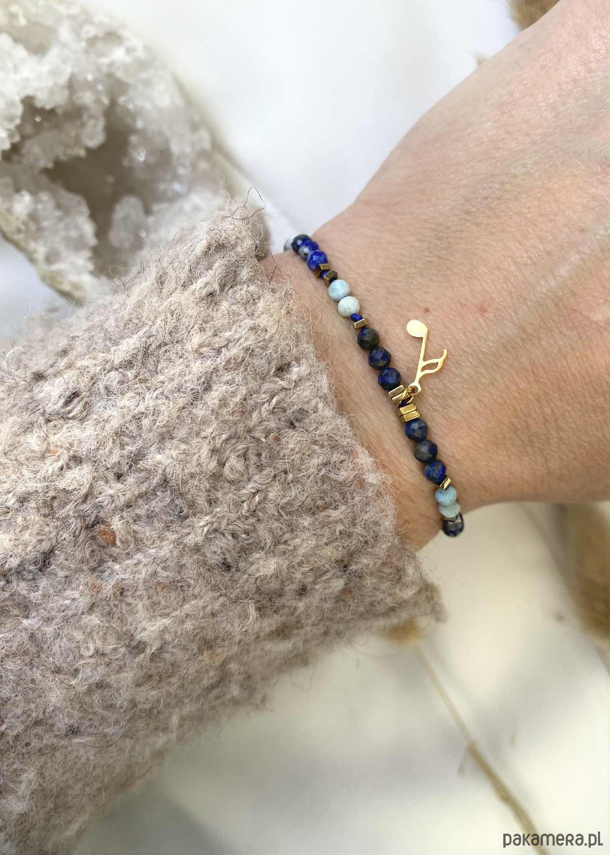 Odkryj wyjątkową bransoletkę z nutką oraz Larimar i Lapis Lazuli, która łączy w sobie elegancję, delikatność i znaczenie symboliczne. Ta minimalistyczna bransoletka z nutką oraz Larimar i Lapis Lazuli została starannie wykonana na niebieskim sznureczku jubilerskim z makramowym wiązaniem, dzięki czemu jest nie tylko piękna, ale i wygodna w noszeniu. Dookoła bransoletki znajdują się drobne, 3mm kamienie larimaru i lapis lazuli, przeplatane złotymi hematytami, które dodają całości blasku. Całość wieńczy złota zawieszka w kształcie minimalistycznej nutki ze stali nierdzewnej, symbolizująca radość, lekkość i harmonię życia.