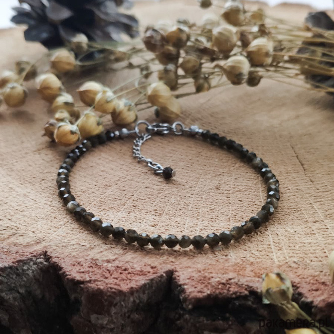 Inspirowana barwami jesieni bransoletka z zielonym obsydianem - minerałem o stonowanej, bardzo nieoczywistej barwie łączącej ciemną zieleń z grafitem, z której promienie słoneczne wydobywają piękny, oliwkowy odcień. Kamienie niezwykle mienią się w słońcu, dzięki szlifowi fasetowemu wspaniale odbijają światło. Bransoletka została wykończona łańcuszkiem regulacyjnym z ozdobnym minerałem, dzięki czemu staje się minimalistyczną, delikatną, a jednak nie pozbawioną elegancji ozdobą.