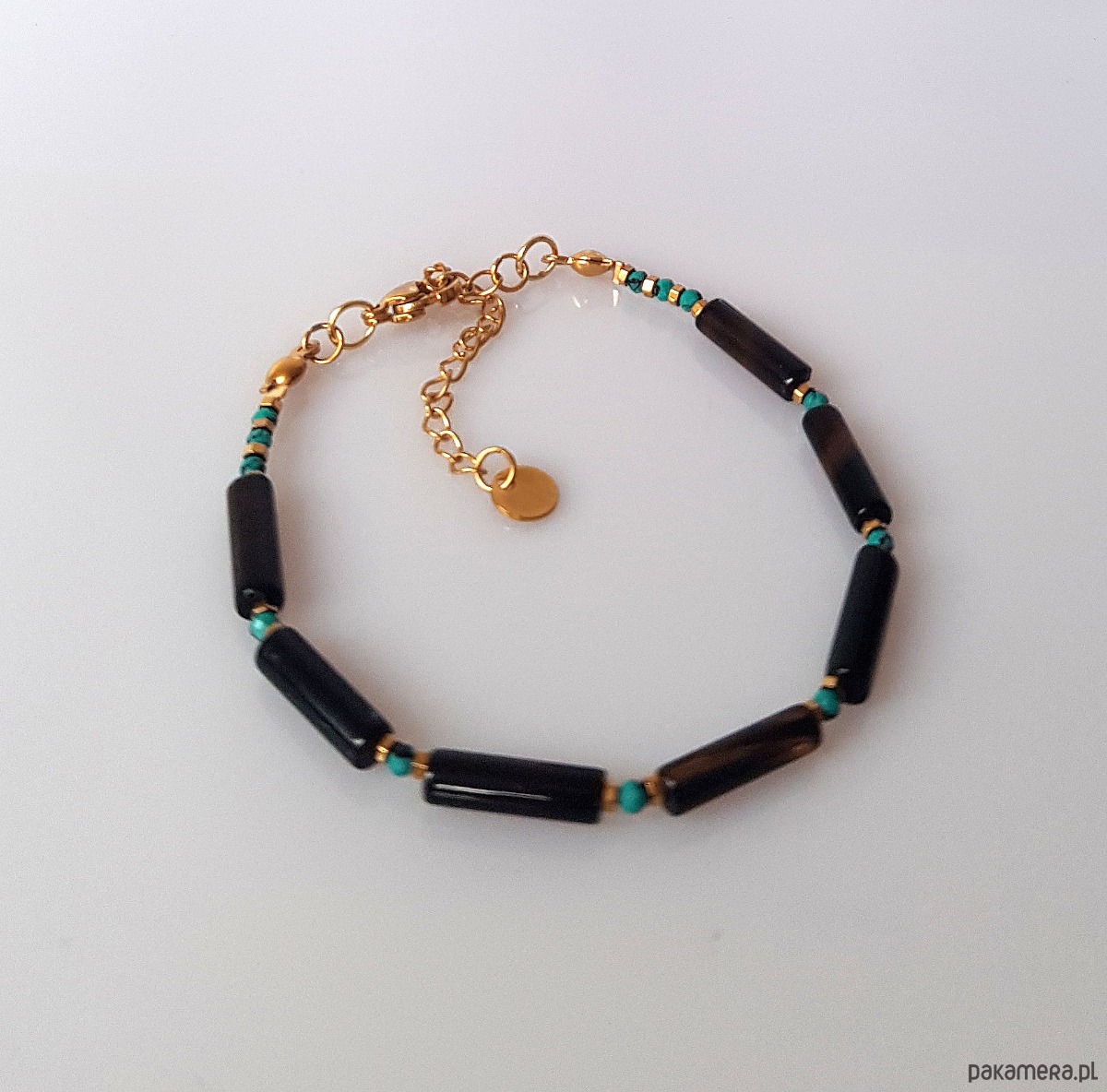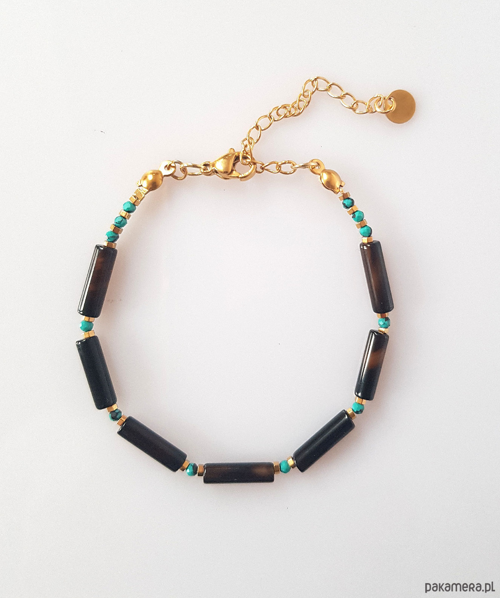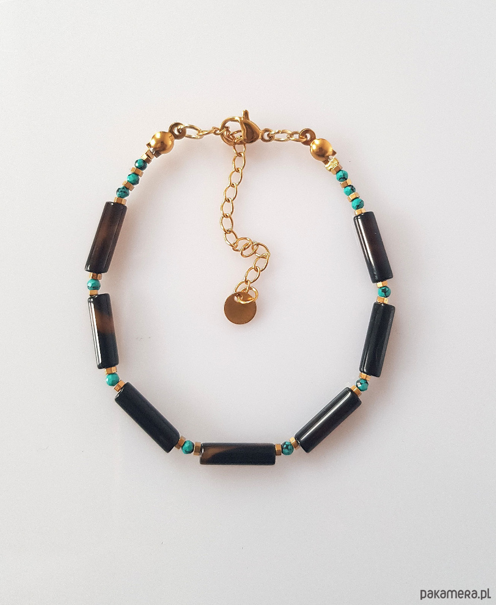 Patyczki onyksu pasiastego i drobne fasetowane kuleczki turkusowego magnezytu.