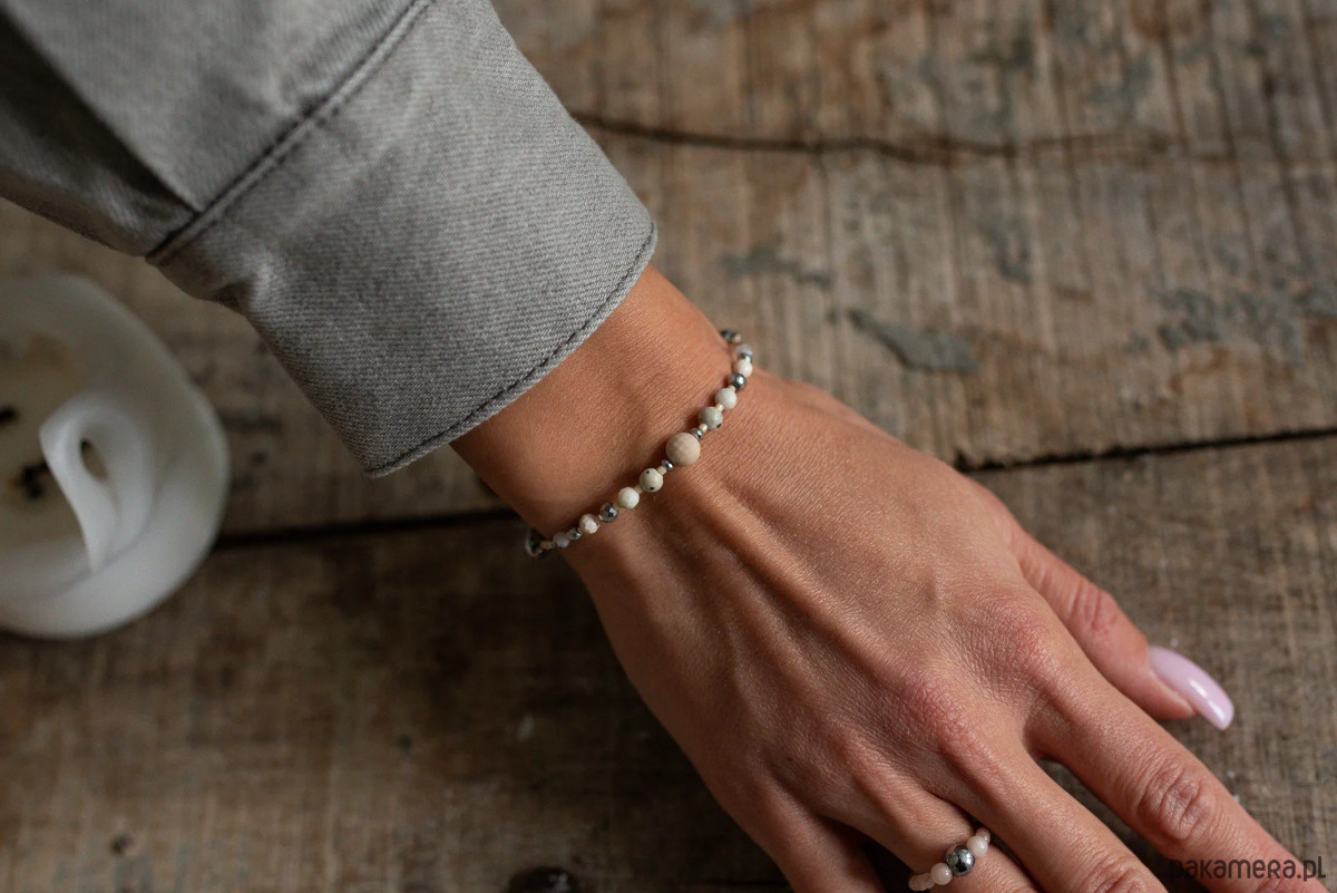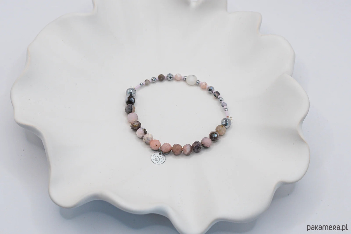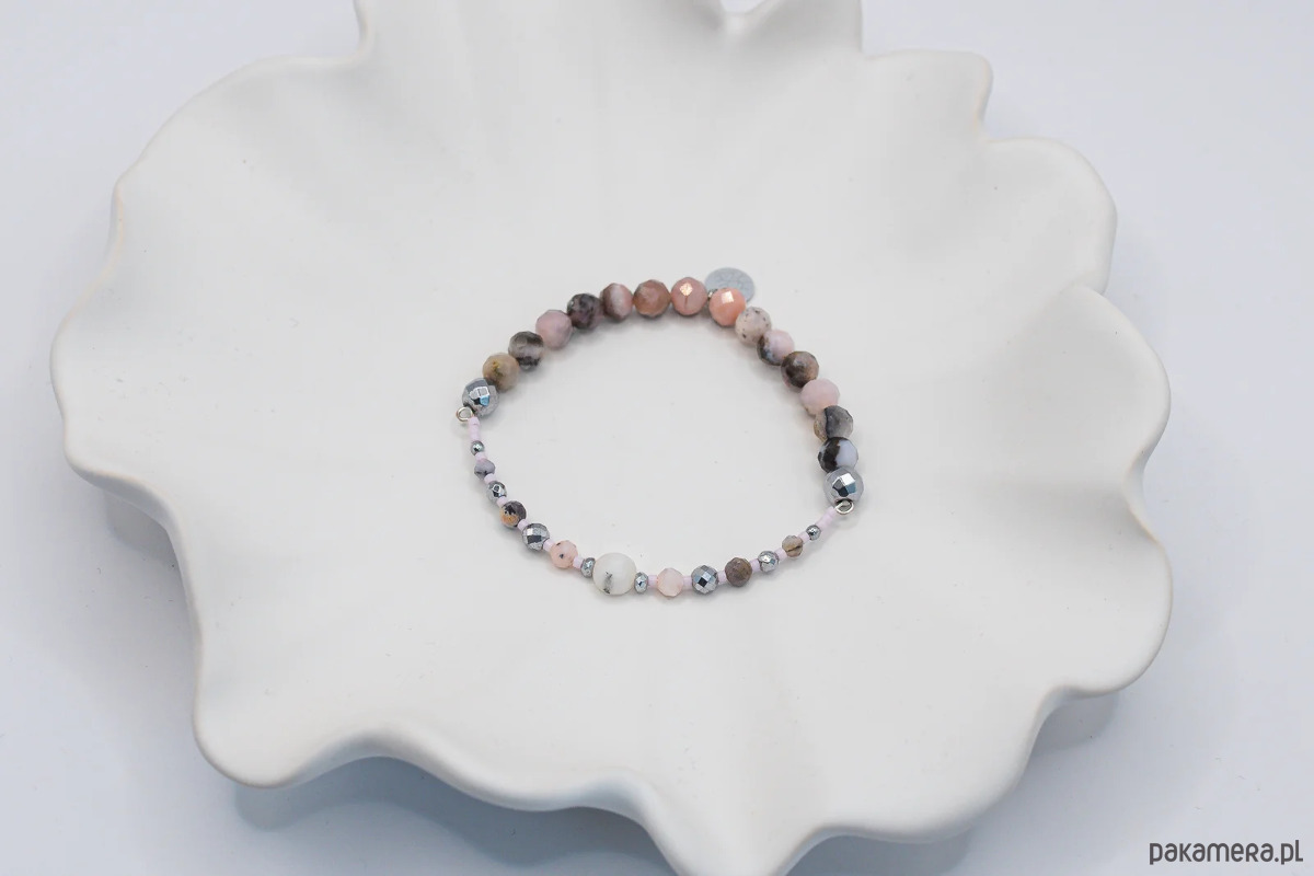 Bransoletka została wykonana przy użyciu okrągłego Opalu, który połączyliśmy z drobnymi Jaspisami oraz Opalami w części sztywnej. Natomiast w części elastycznej użyliśmy fasetowane Opale Różowe (6 mm), a za wykończenie kompozycji odpowiada srebrny Hematyt. Wszystkie elementy w biżuterii są 100% antyalergiczne.