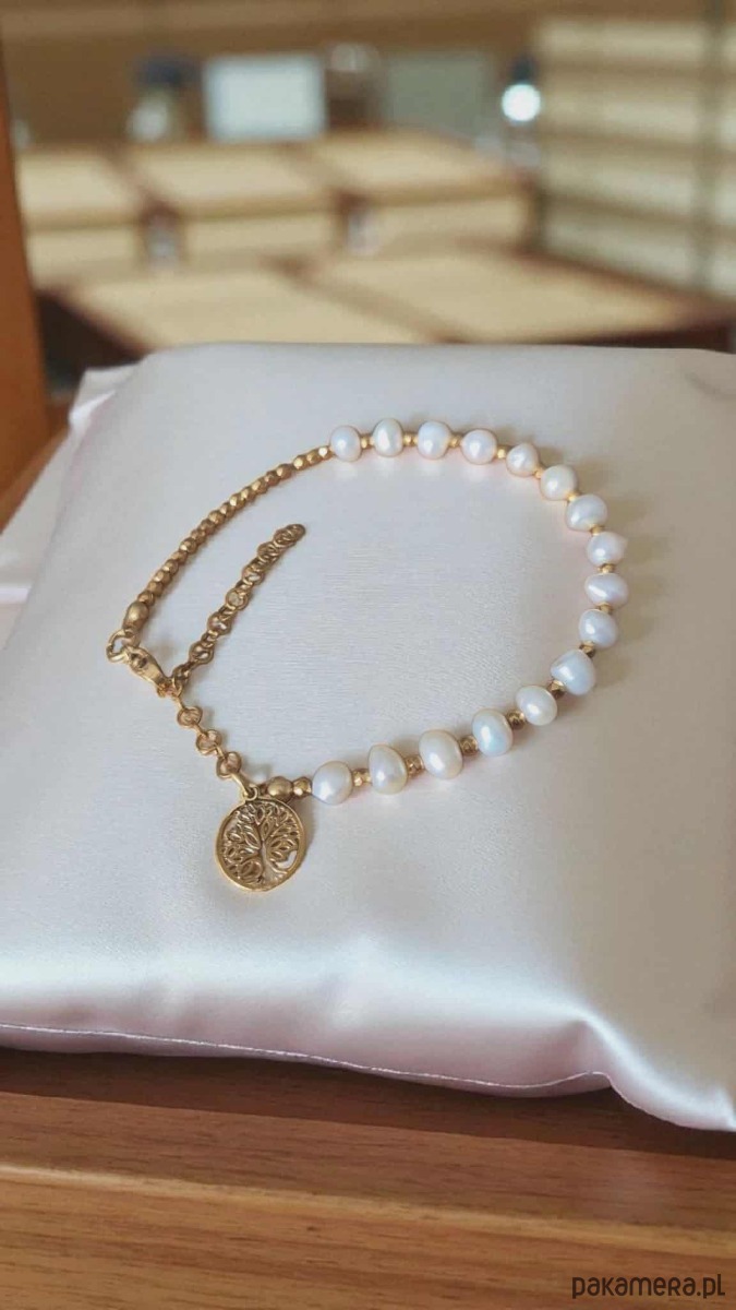 Elegancka bransoletka wykonana z pereł naturalnych hodowlanych, słodkowodnych oraz kulek hematytu. Zdobiona zawieszką „Drzewo życia” wykonaną ze stali chirurgicznej, z zapięciem i przedłużką również ze stali szlachetnej – odpornej na ścieranie i przebarwienia.