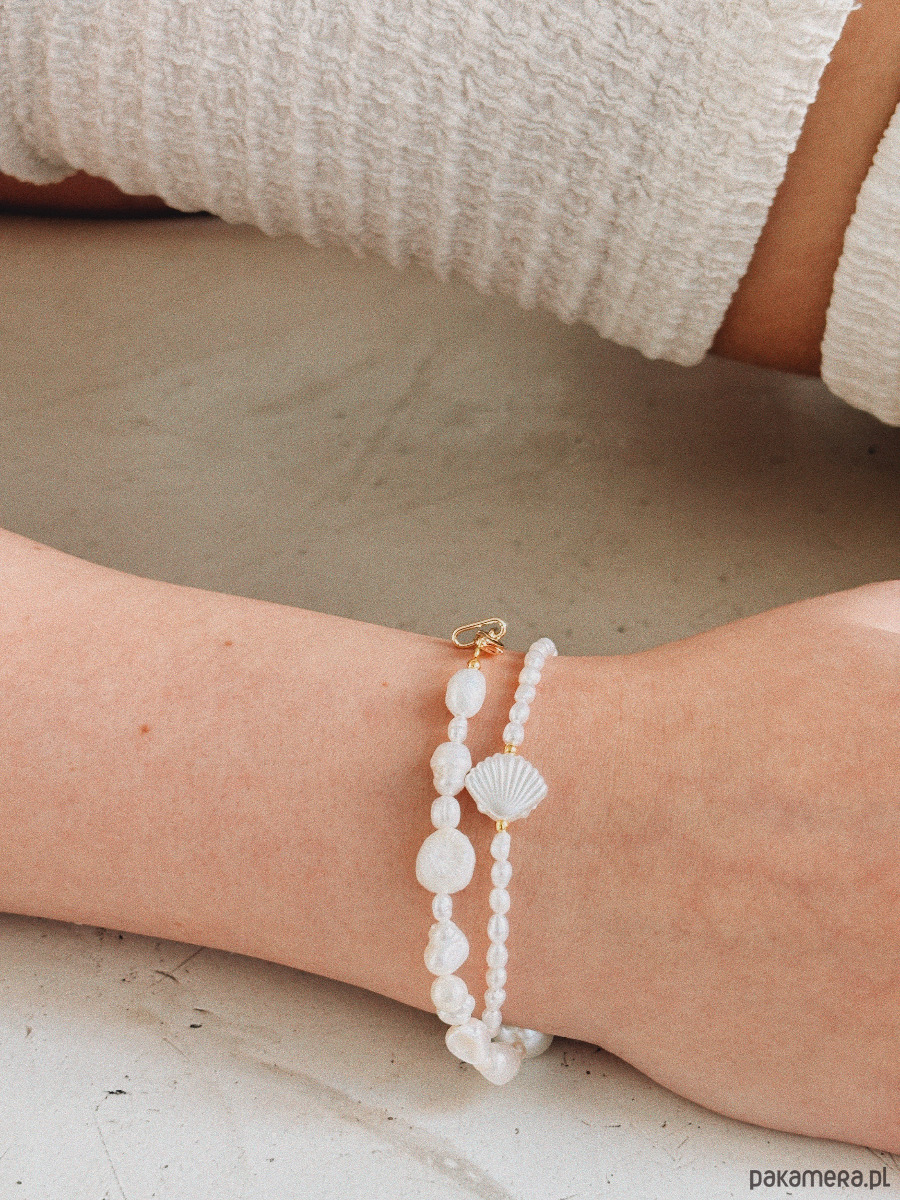Bransoletka wykonana jest z pereł naturalnych, z przekładką muszelką, zapięcia I łańcuszka ze stali ch.
