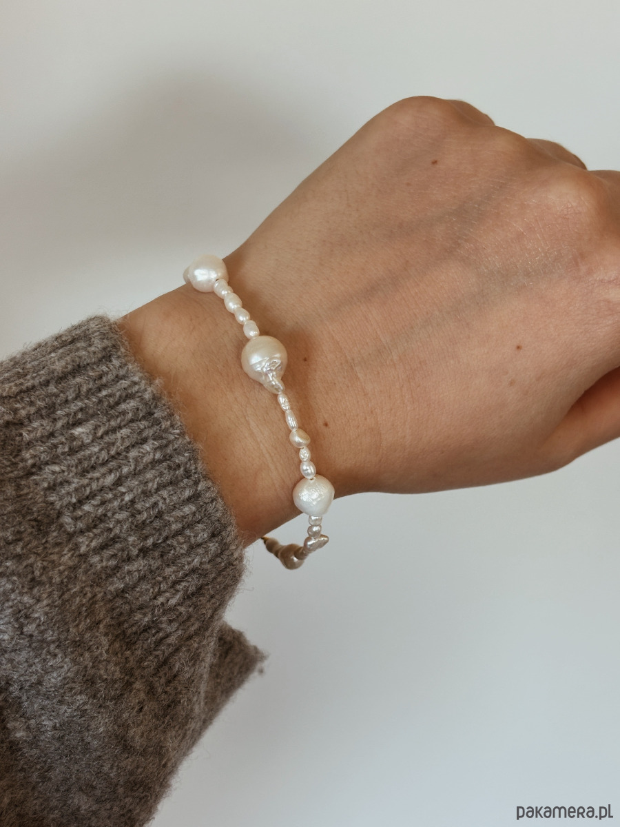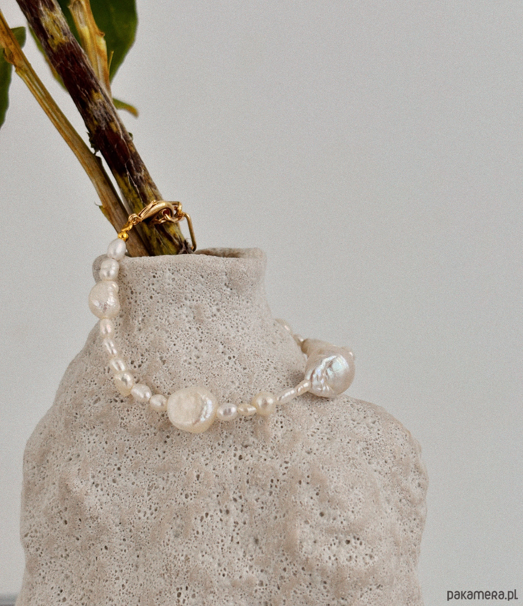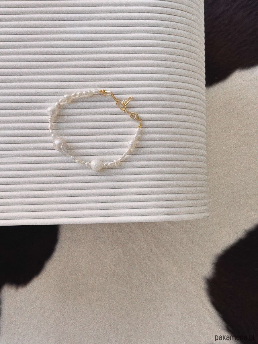 Bransoletka wykonana jest z pereł hodowlanych, zapięcia i łańcuszka rodowanych 18K złotem.