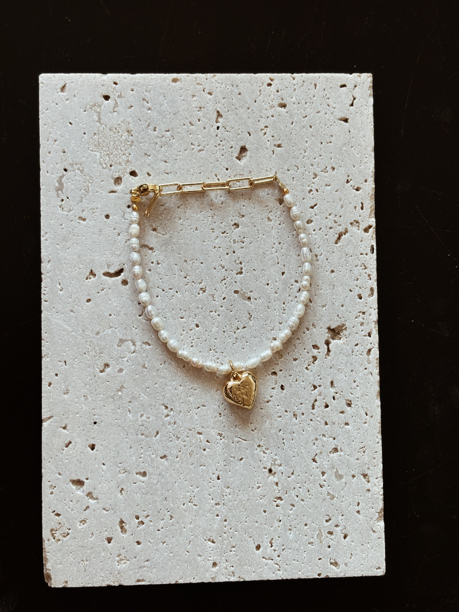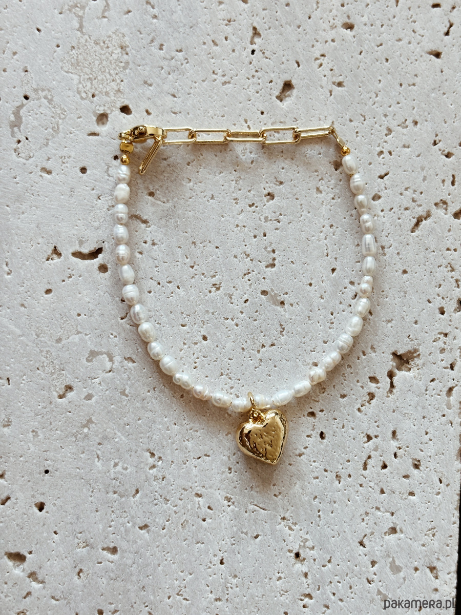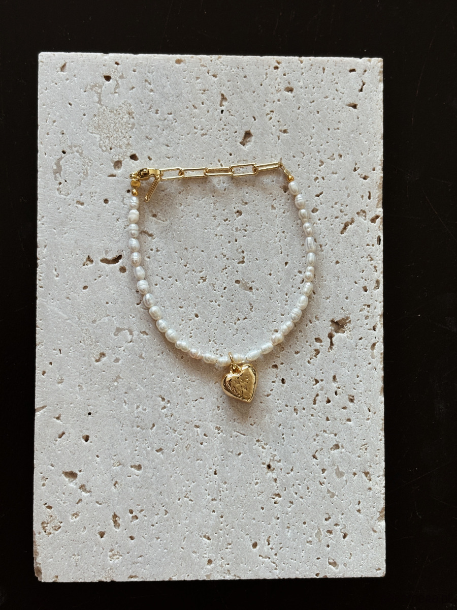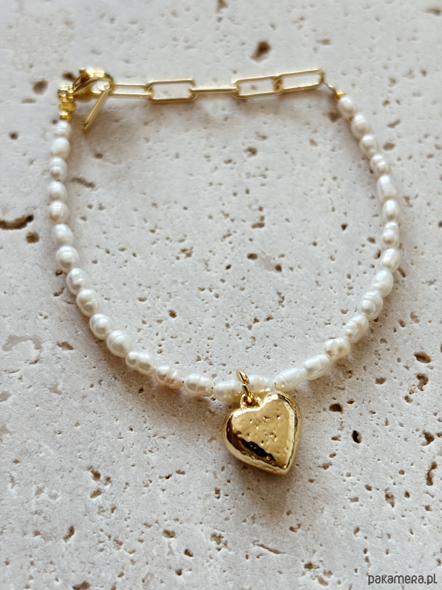 Bransoletka wykonana jest z pereł naturalnych, zapięcia I łańcuszka ze stali ch, zawieszka serce jest rodowana złotem.