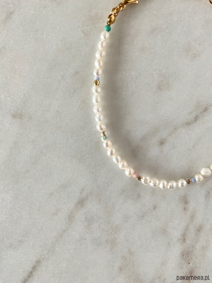Kobieca i delikatna bransoletka z pereł naturalnych słodkowodnych, podkręcona autorską mieszanką Mix&Match, oznacza to, że perły są nieregularnie przeplatane koralikami i drobnymi kamieniami naturalnymi, sprawia to, że design nabiera lekkości i szyku. Dodatek idealny do każdej stylizacji, od tych wakacyjnych po bardziej eleganckie.