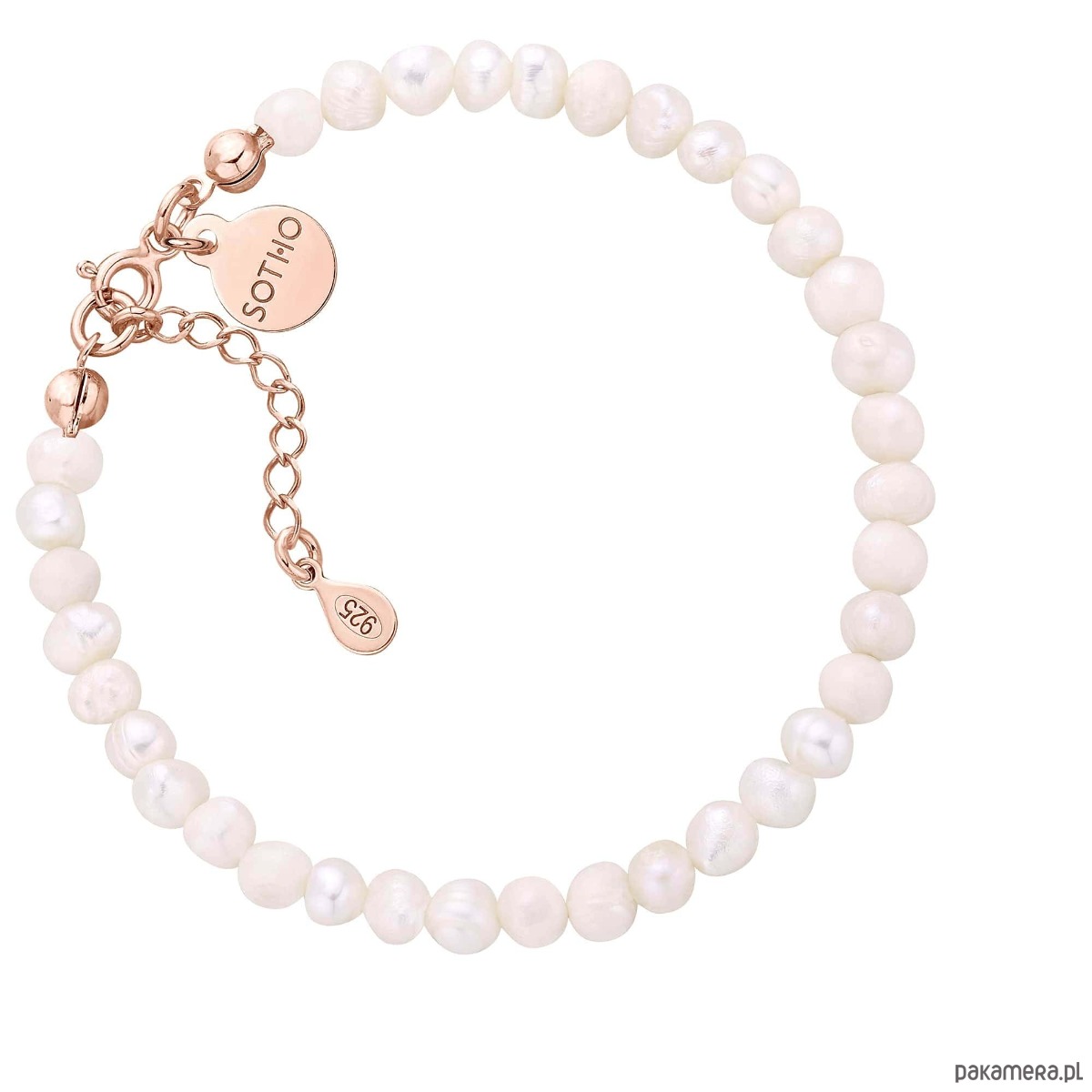 Bransoletka wykonana z naturalnych pereł słodkowodnych, zdobiona zawieszką z logo marki. Wszystkie elementy wykonane ze srebra 925 pokrytego 18 karatowym różowym złotem.