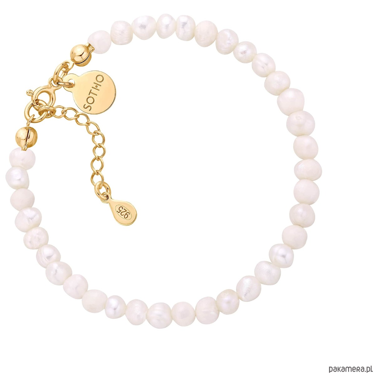 Bransoletka wykonana z naturalnych pereł słodkowodnych, zdobiona zawieszką z logo marki. Wszystkie elementy wykonane ze srebra 925 powlekanego 24 karatowym żółtym złotem. Perły są nieregularne, unikatowe, delikatnie różnią się od siebie i mogą różnić się od tych na zdjęciu.