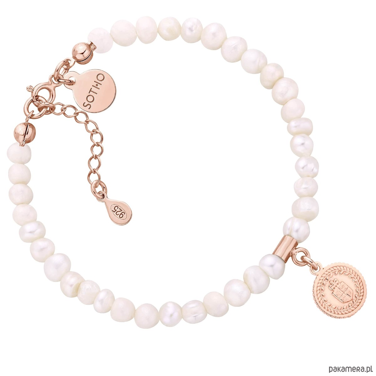 Bransoletka wykonana z naturalnych pereł słodkowodnych, zdobiona medalionem i zawieszką z logo marki. Wszystkie elementy wykonane ze srebra 925 pokrytego 18 karatowym różowym złotem.