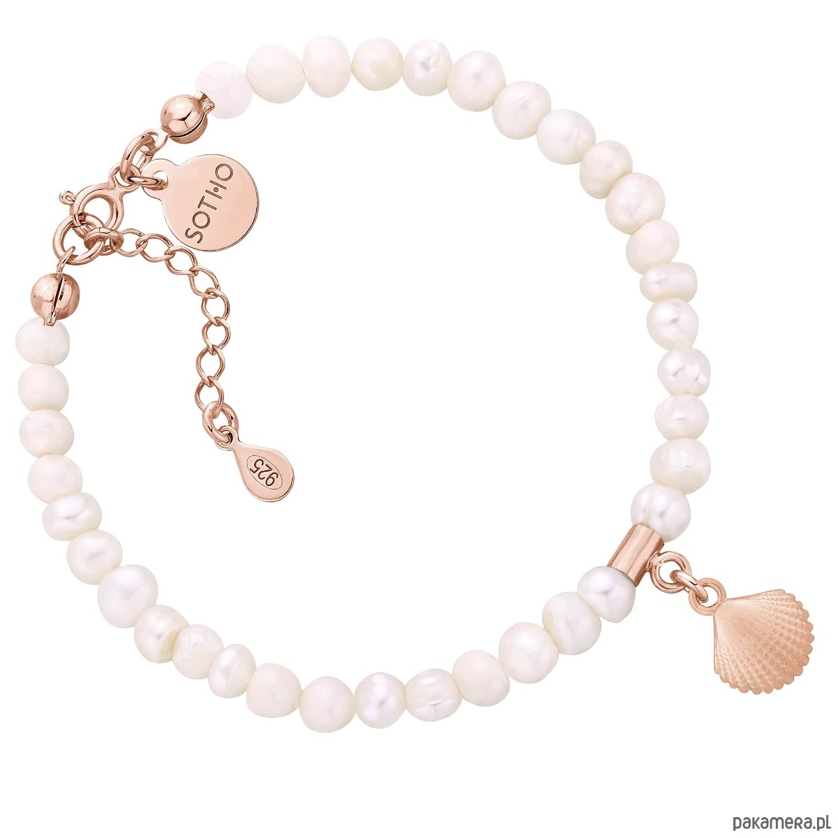 Bransoletka wykonana z naturalnych pereł słodkowodnych, zdobiona muszelką i zawieszką z logo marki. Wszystkie elementy wykonane ze srebra 925 pokrytego 18 karatowym różowym złotem.