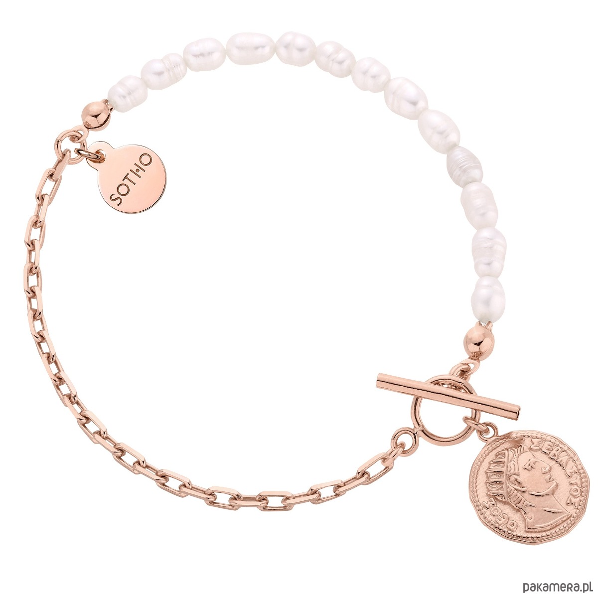 Złota bransoletka z naturalnych pereł zdobiona monetą, łańcuchem i zawieszką z logo marki. Całość wykonana ze srebra 925 pokrytego 18 karatowym różowym złotem.