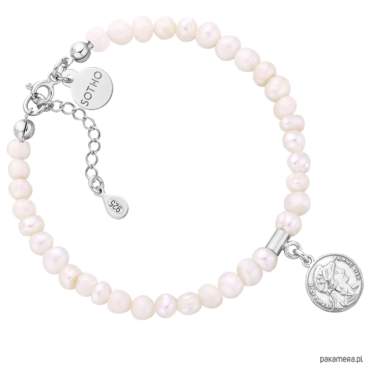 Bransoletka wykonana z naturalnych pereł słodkowodnych, zdobiona monetą i zawieszką z logo marki. Wszystkie elementy wykonane ze srebra 925.