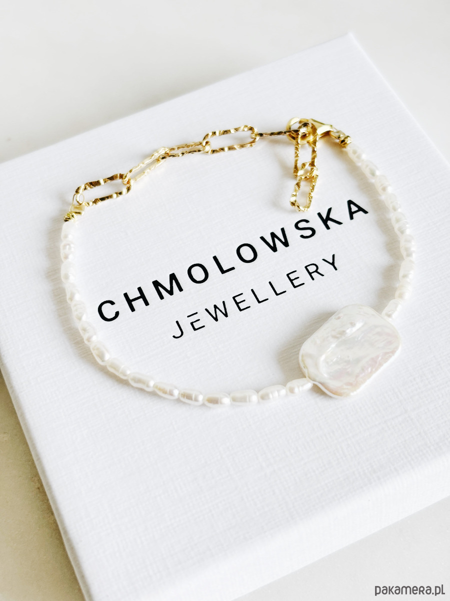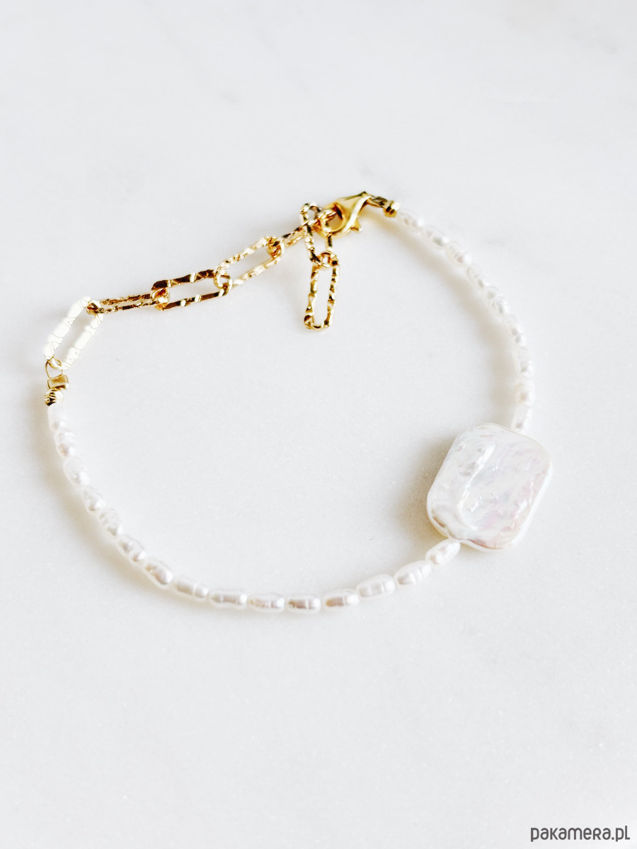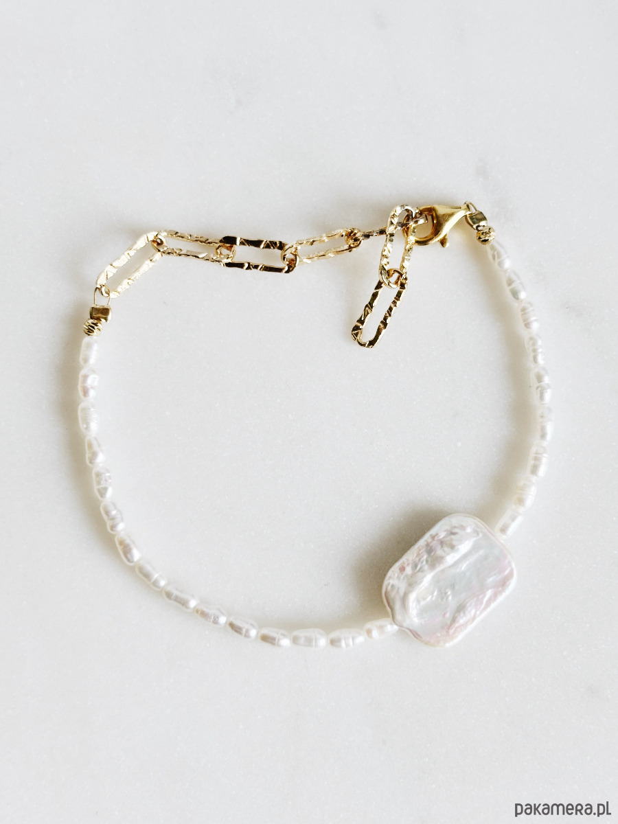 Bransoletka wykonana jest na lince jubilerskiej z użyciem pereł naturalnych słodkowodnych w różnym kształcie i rozmiarze. Zapięcie i łańcuszek są rodowane złotem, łańcuszek posiada specyficzną strukturę gniecenia.
