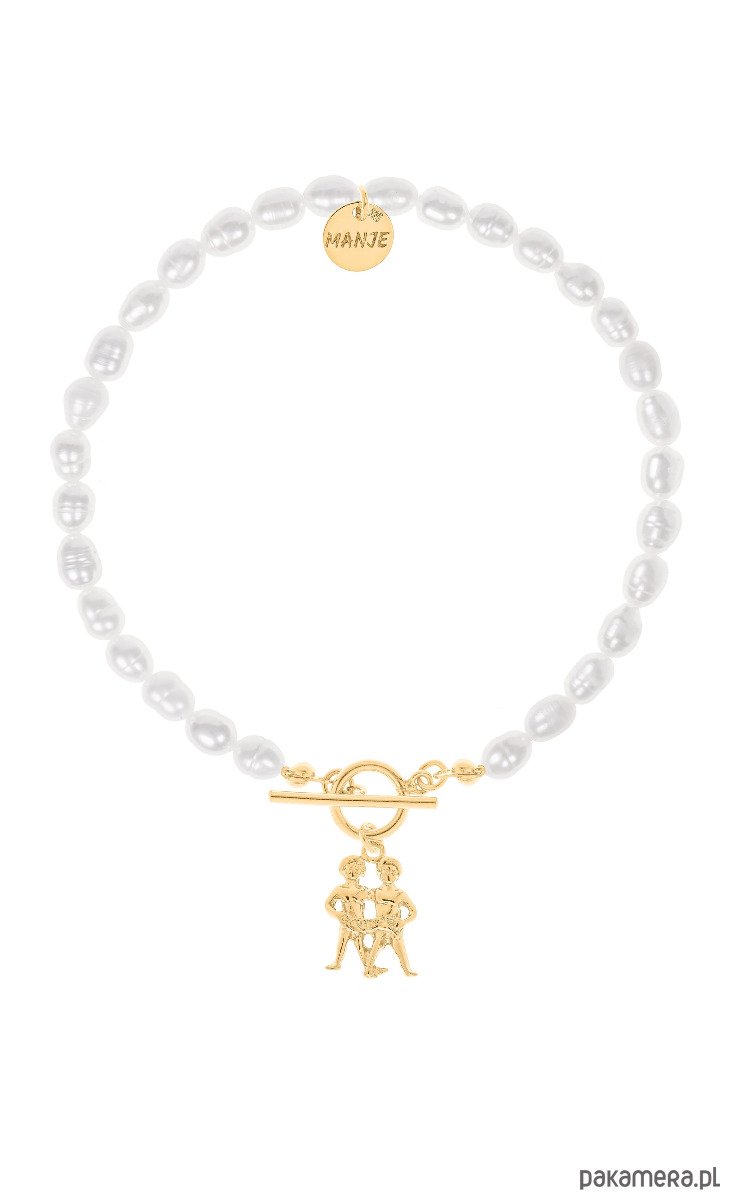 Bransoletka z naturalnych pereł z pozłacanym znakiem zodiaku Bliźnięta. Bransoletka wykonana jest z białych naturalnych pereł hodowlanych. Zawieszka, zapięcie oraz logo wykonane ze srebra próby 925, pokryte 18-karatowym złotem.