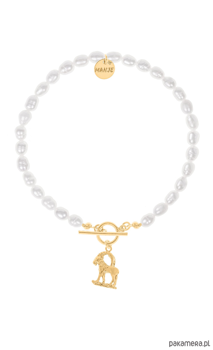 Bransoletka z naturalnych pereł z pozłacanym znakiem zodiaku Koziorożec. Bransoletka wykonana jest z białych naturalnych pereł hodowlanych. Zawieszka, zapięcie oraz logo wykonane ze srebra próby 925, pokryte 18-karatowym złotem.
