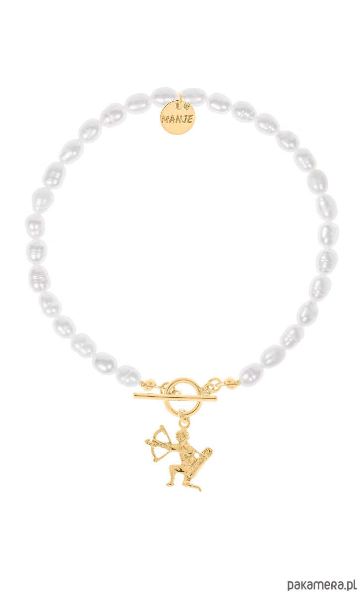 Bransoletka z naturalnych pereł z pozłacanym znakiem zodiaku Strzelec. Bransoletka wykonana jest z białych naturalnych pereł hodowlanych. Zawieszka, zapięcie oraz logo wykonane ze srebra próby 925, pokryte 18-karatowym złotem.