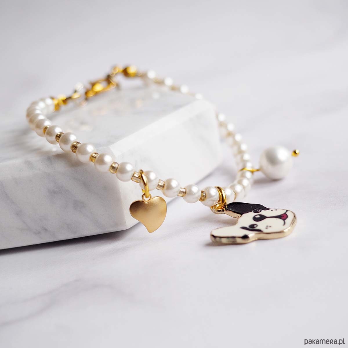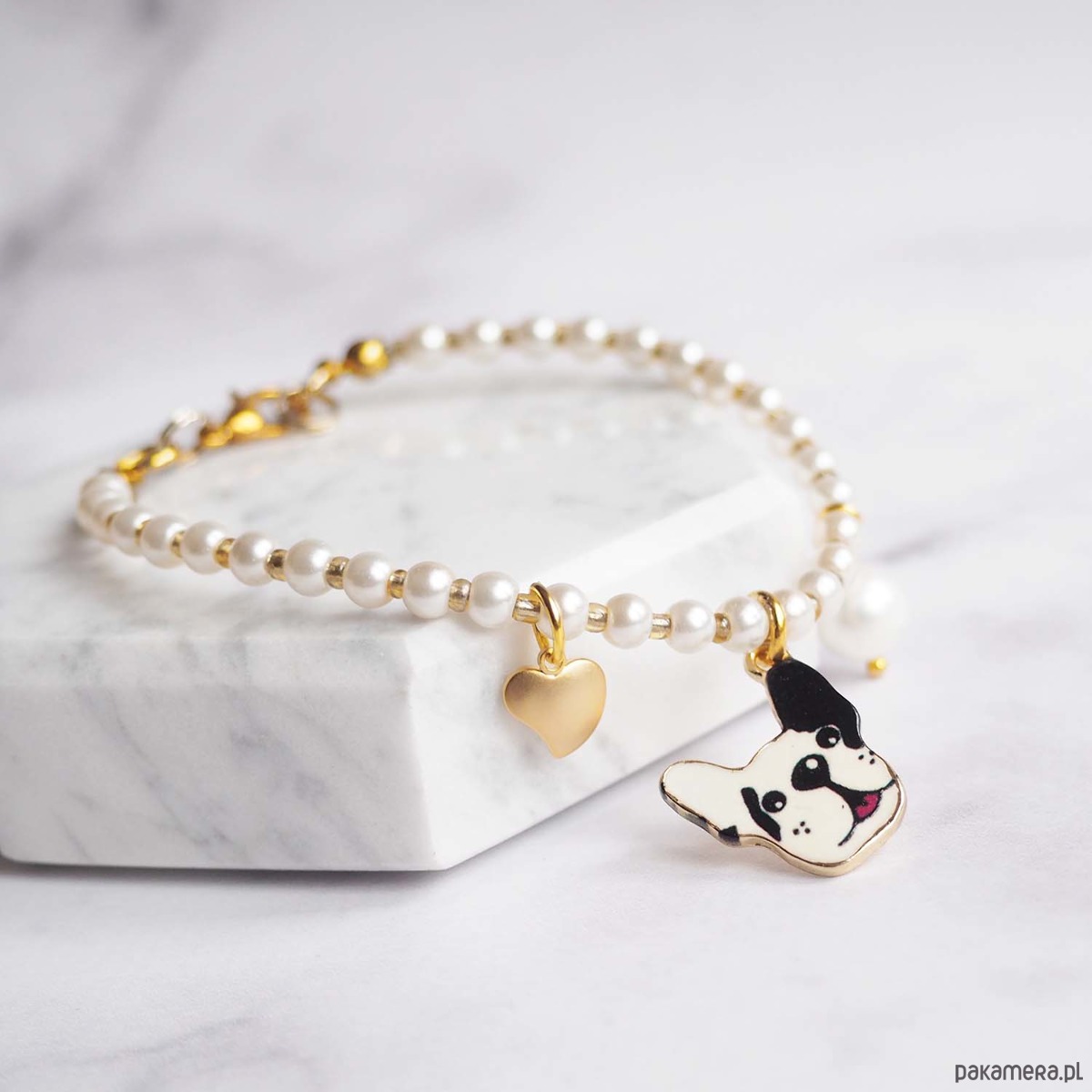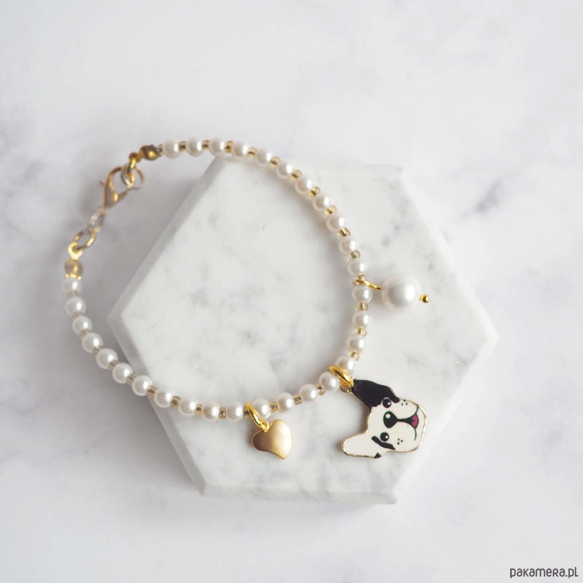 BRANSOLETKA Z PEREŁ Z ZAWIESZKĄ BULDOG, serduszko i perłaieszką