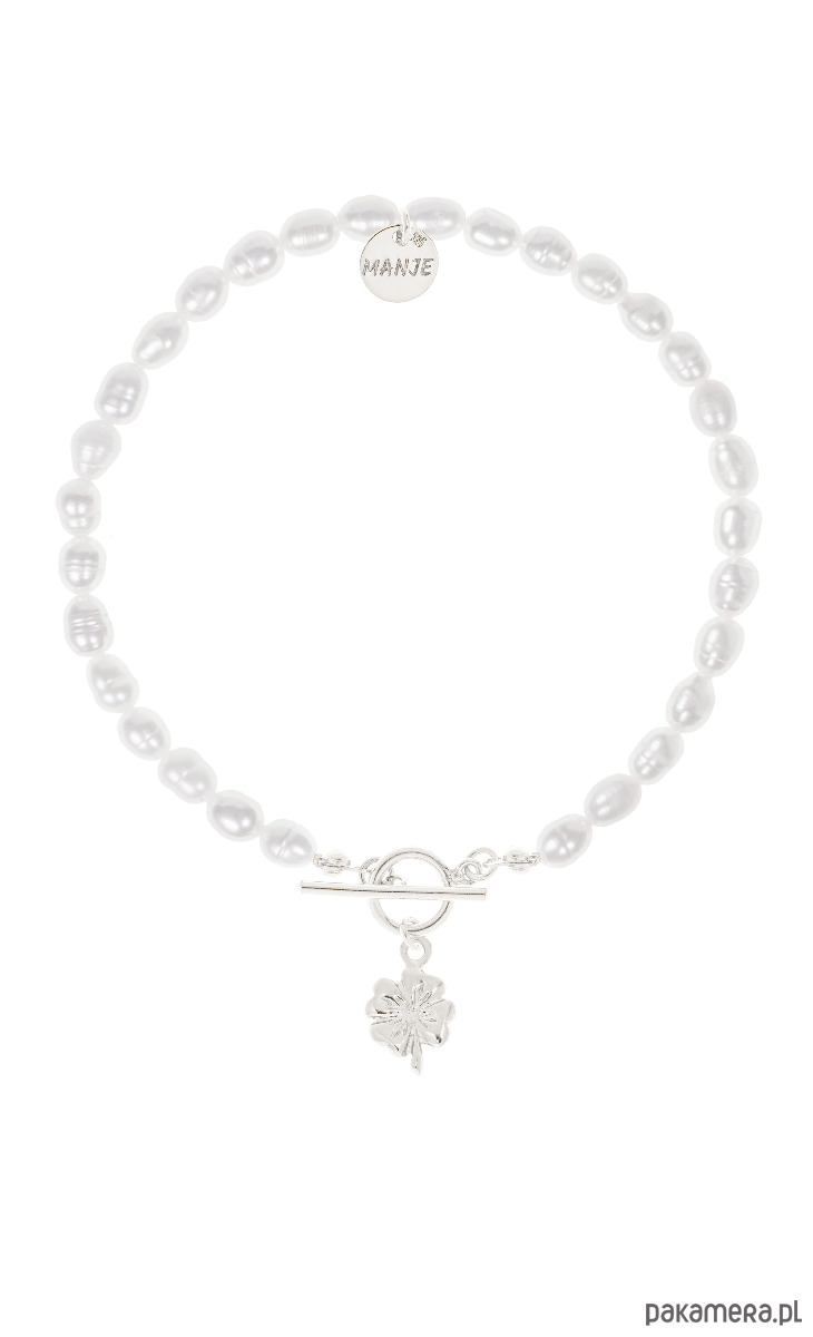 Bransoletka z naturalnych pereł ze srebrną koniczynką. Bransoletka wykonana jest z białych naturalnych pereł hodowlanych. Zawieszka, zapięcie oraz logo wykonane ze srebra próby 925.